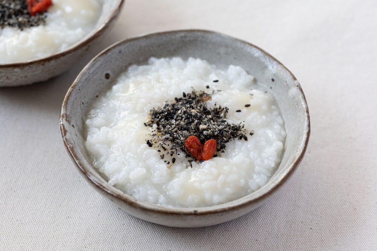 蒸らしが完了したら、すりおろした黒ごまをおかゆに混ぜ込む。塩で味をととのえて、器に盛りつけたら完成!