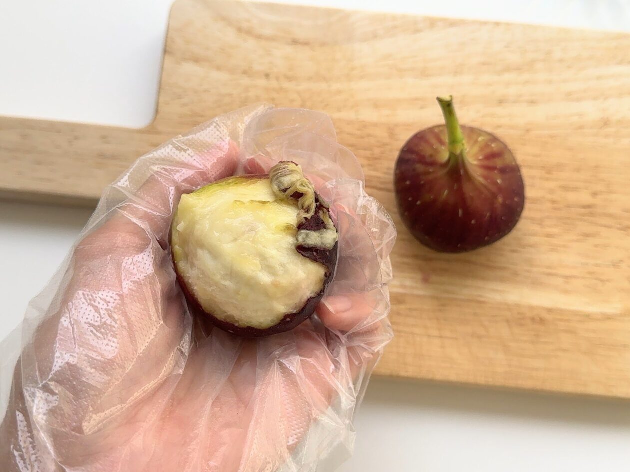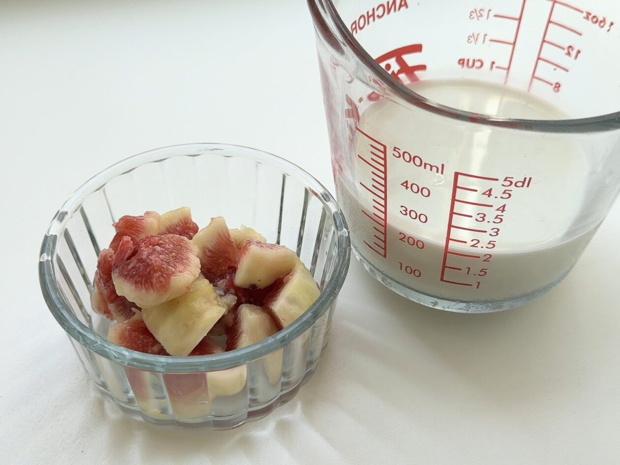 鍋の様子を見守りつつ、下ごしらえを済ませておく。いちじくの皮をむき、ざく切りにする。牛乳200mlを計量しておく。