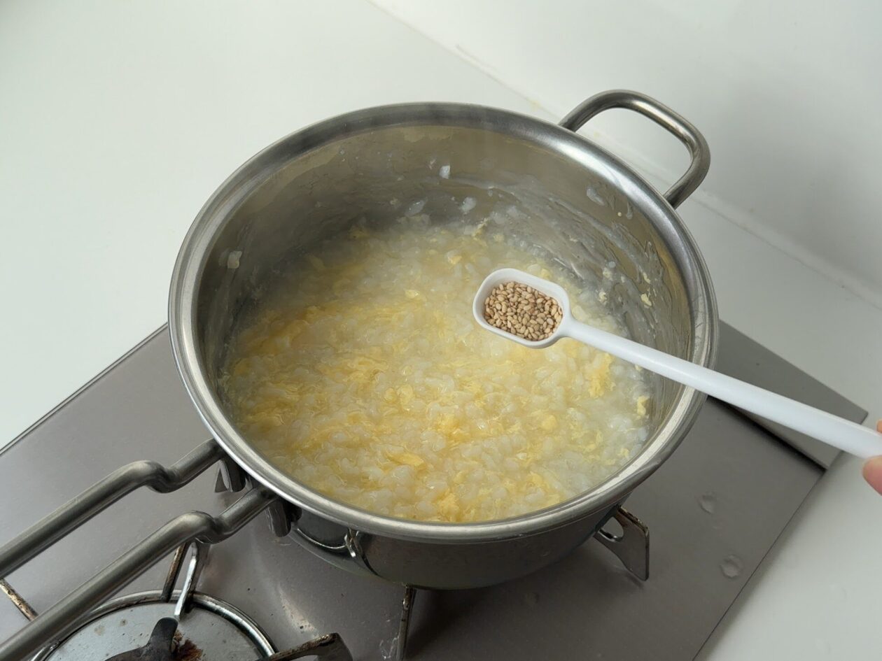基本のたまご粥に白ごまを混ぜ込むことで、魚介特有の臭みをマスキングしつつ、控えめな甘みが全体のまとまりをぐっとよくしてくれるのです◎
