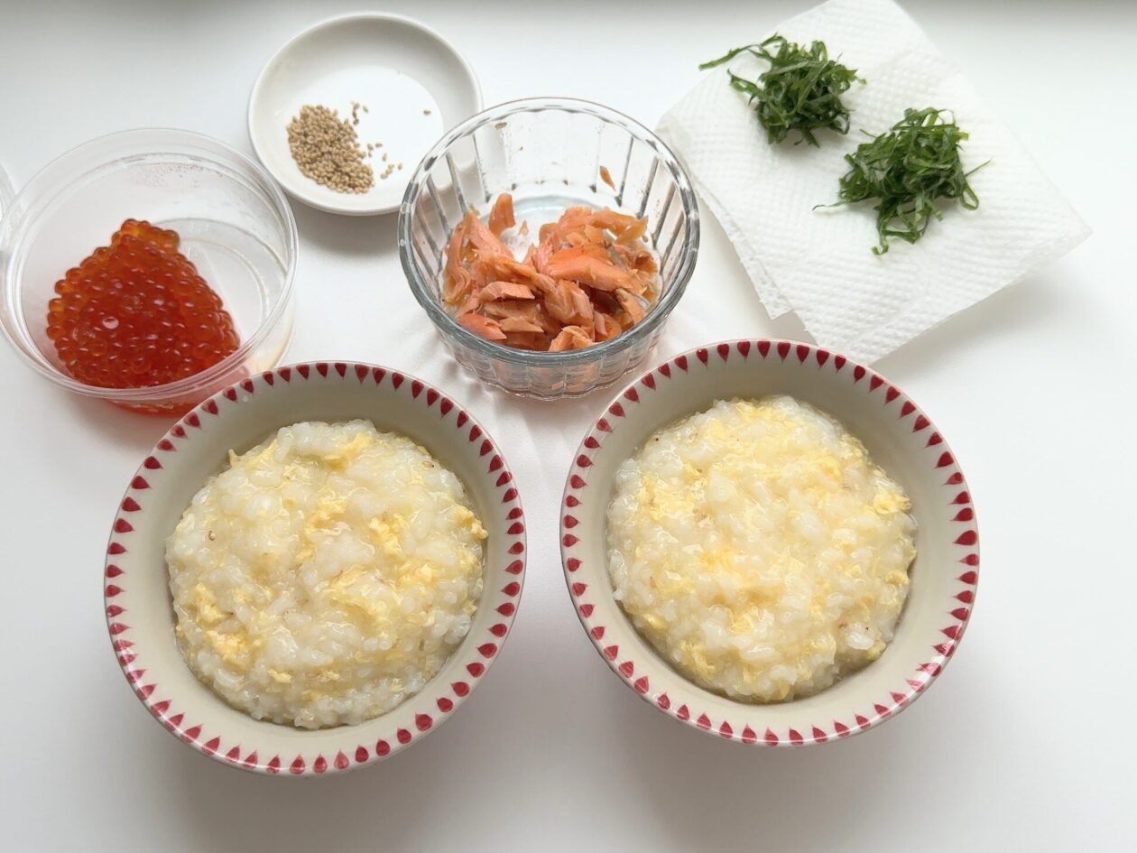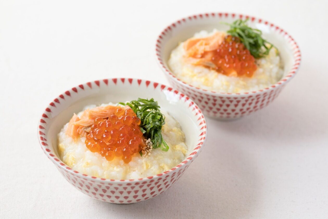 おかゆを器に盛り付け、鮭のほぐし身、いくらを乗せたら完成!