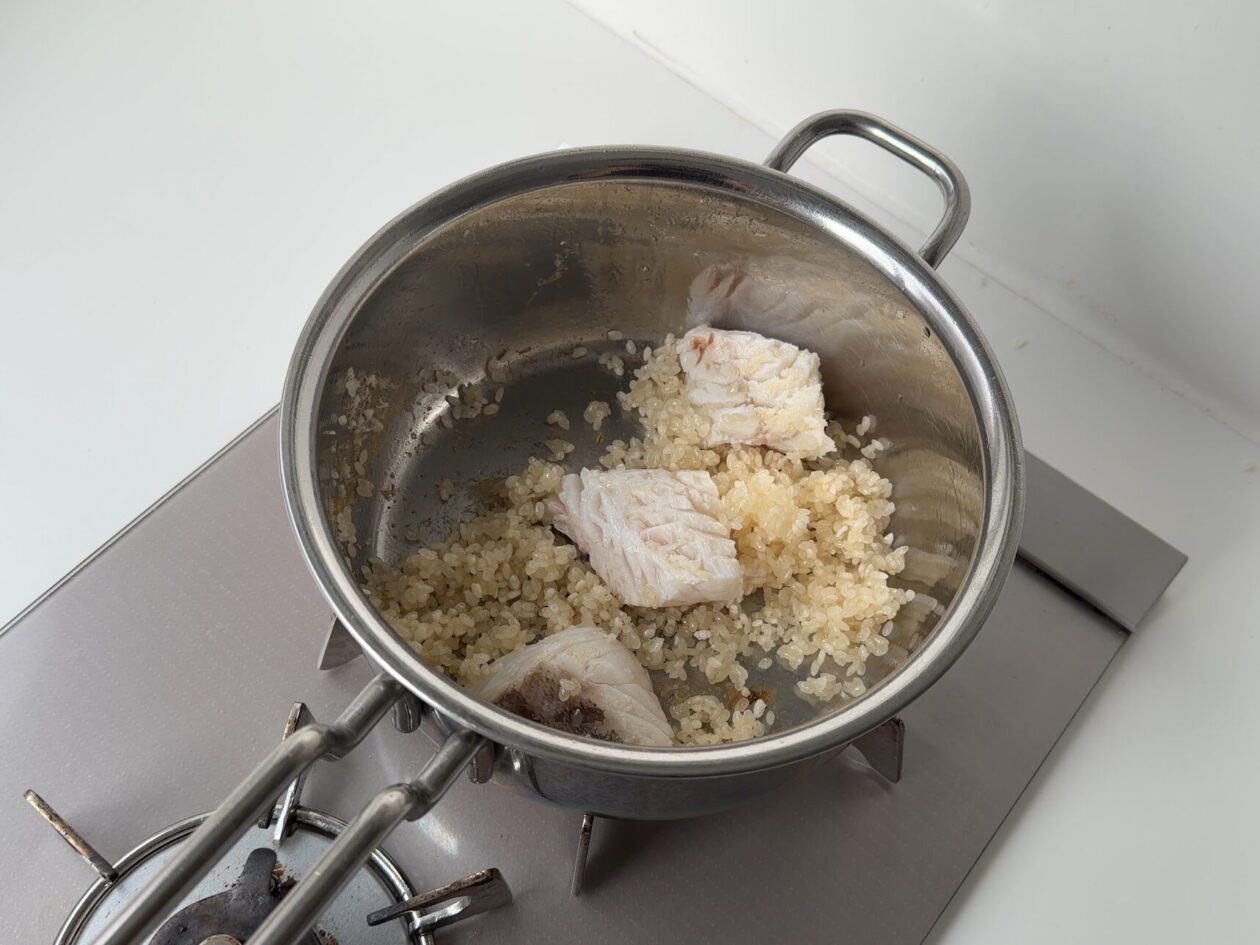鍋にごま油を熱し、研いだ米、たらを中火で炒める。