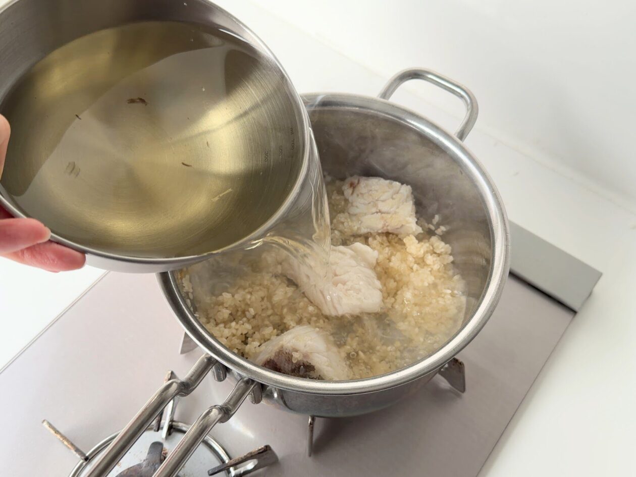 油がまわり、たらの表面に火が入ったら、だし汁を入れ全体を混ぜる。