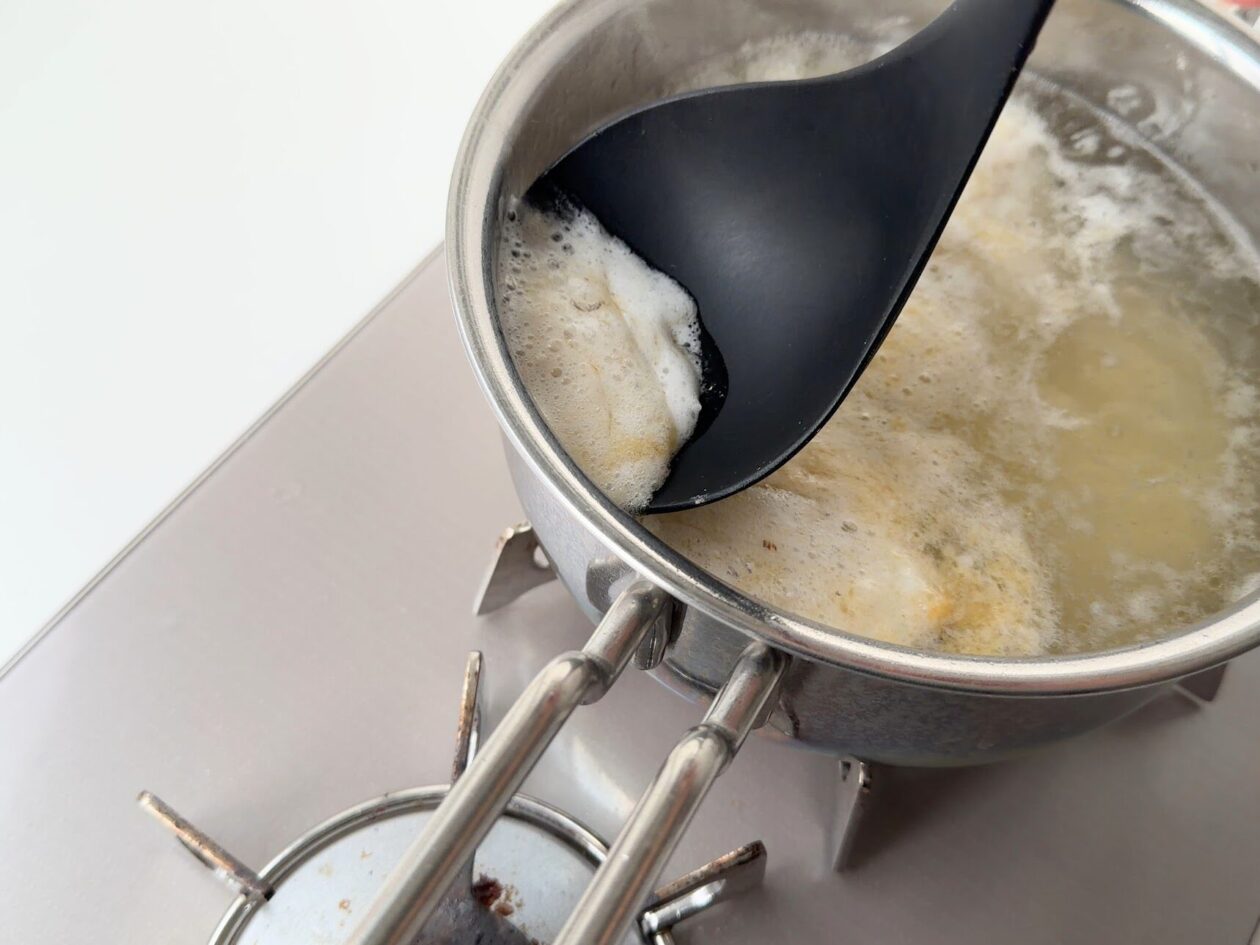 鍋の中がぽこぽこと沸いたら、さっとアクをすくいとる。鍋にお箸を渡してフタをした状態で、ふつふつと波打つ程度の弱〜中火で30分煮込む。