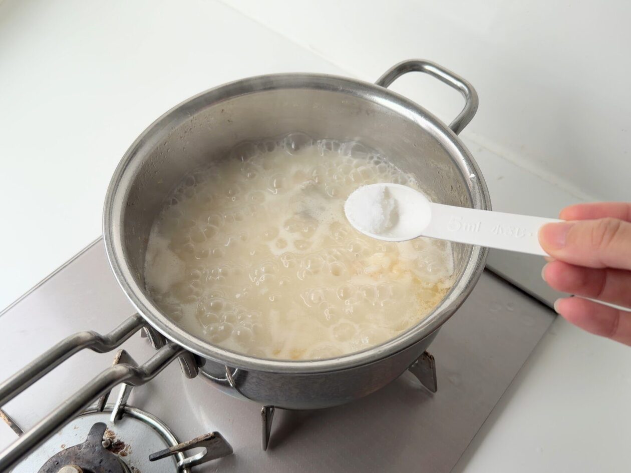 塩で味をととのえる。鍋全体をゆっくりとまぜて火を止める。フタをして5分ほど放置して蒸らす。器に盛りつけたら完成!