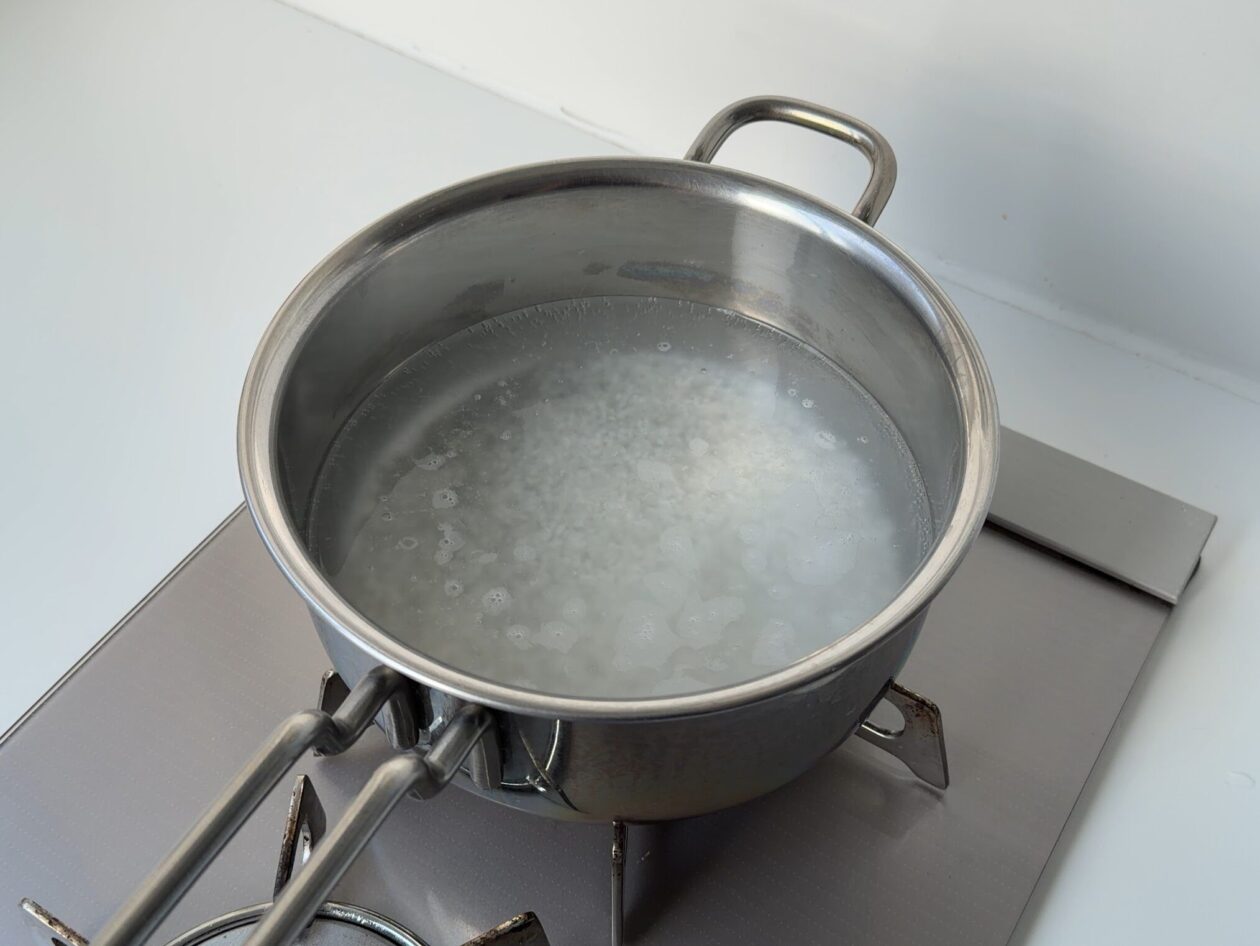 厚手の鍋に研いだ米、水600mlを入れる。具材のかたよりがないように鍋底をならして、中〜強火にかける。