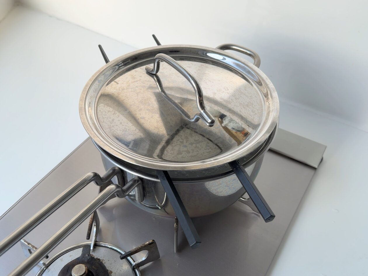 鍋の中がぽこぽこと沸いたら、鍋底から米粒をはがすようにおたまでゆっくりまぜる。鍋にお箸を渡してフタをした状態で、ふつふつと波打つ程度の弱〜中火で20分煮込む。