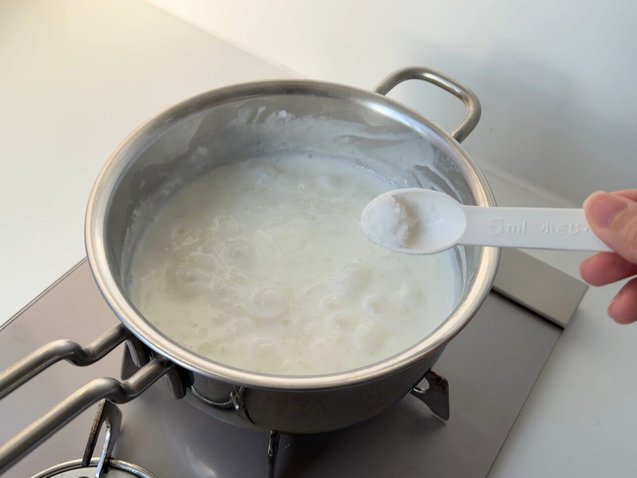 牛乳を鍋に入れやさしく混ぜる。一度少し火を強め、クツクツとさせる。弱火にし、ときどき混ぜながらさらに10分煮込む。