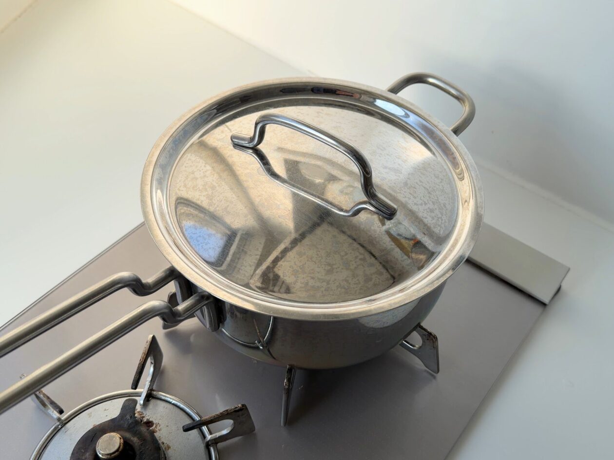 牛乳だけで煮るとギトギトになるので、水とブレンドするのが一番のポイントです。