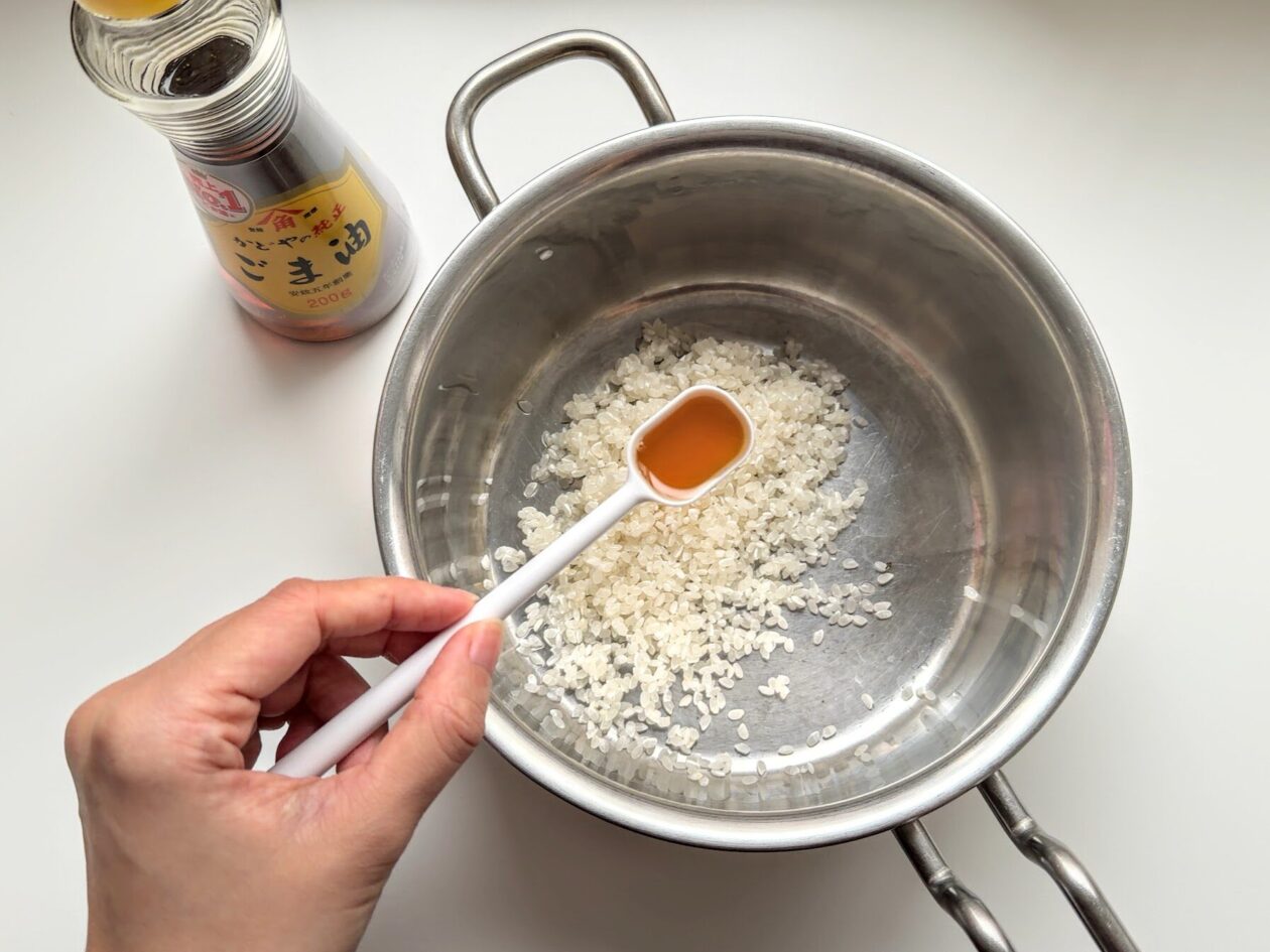 厚手の鍋に研いだ米を入れ、ごま油を絡める。水800mlを入れる。具材のかたよりがないように鍋底をならして、中〜強火にかける。