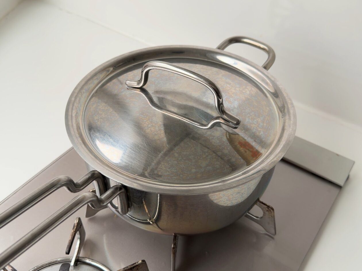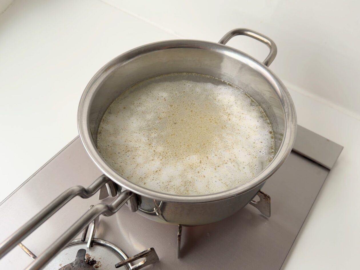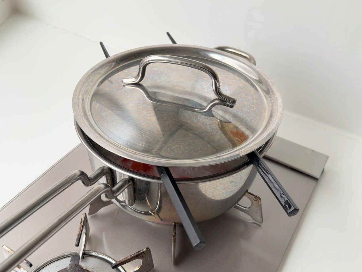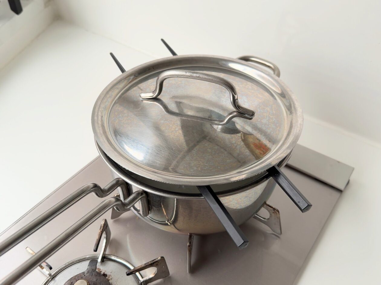 鍋の中がぽこぽこと沸いたら、鍋底から米粒をはがすようにおたまでゆっくりまぜる。鍋にお箸を渡してフタをした状態で、ふつふつと波打つ程度の弱〜中火で25分煮込む。