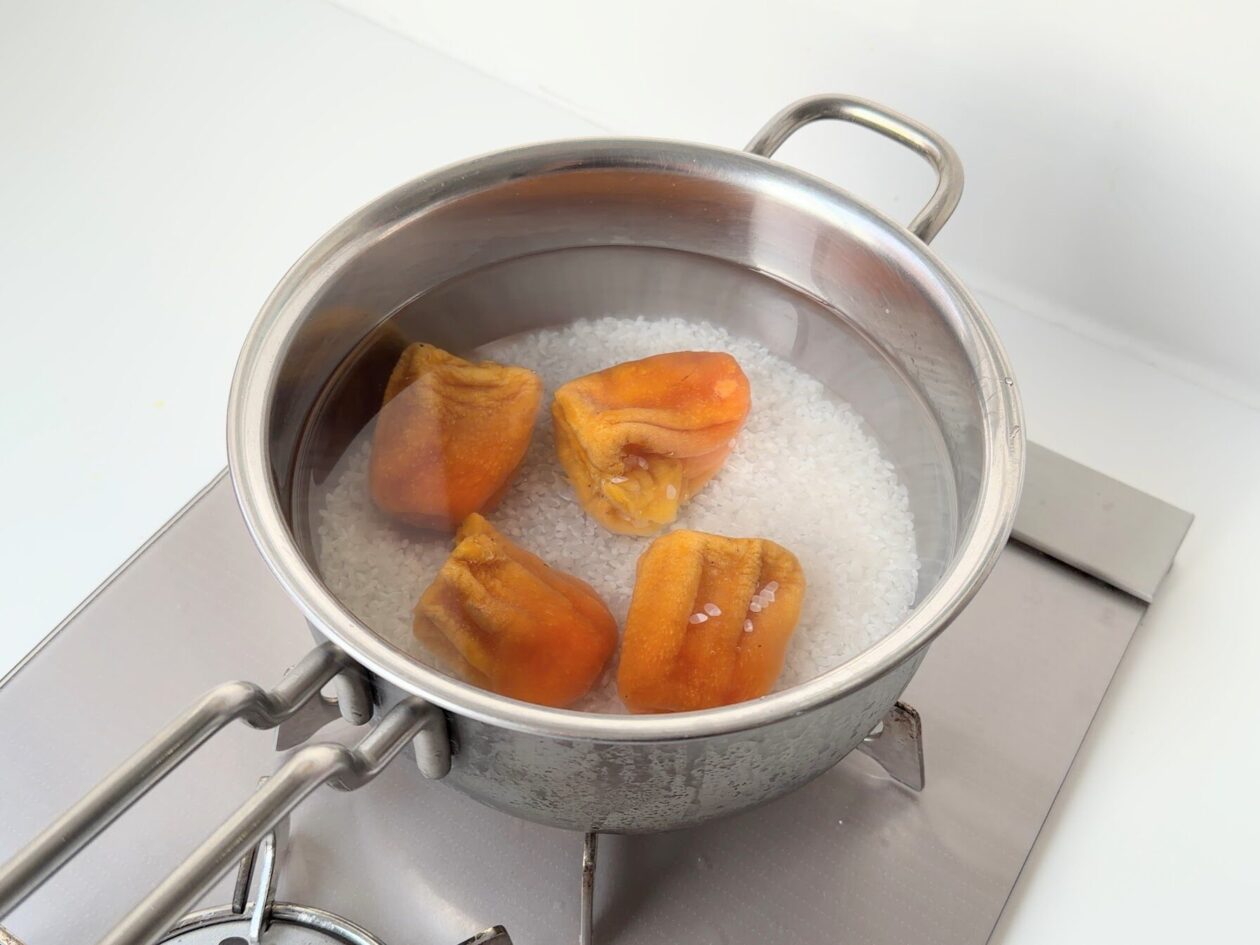 厚手の鍋に研いだ米、ヘタを取り除いた干し柿、水800mlを入れる。具材のかたよりがないように鍋底をならして、中〜強火にかける。