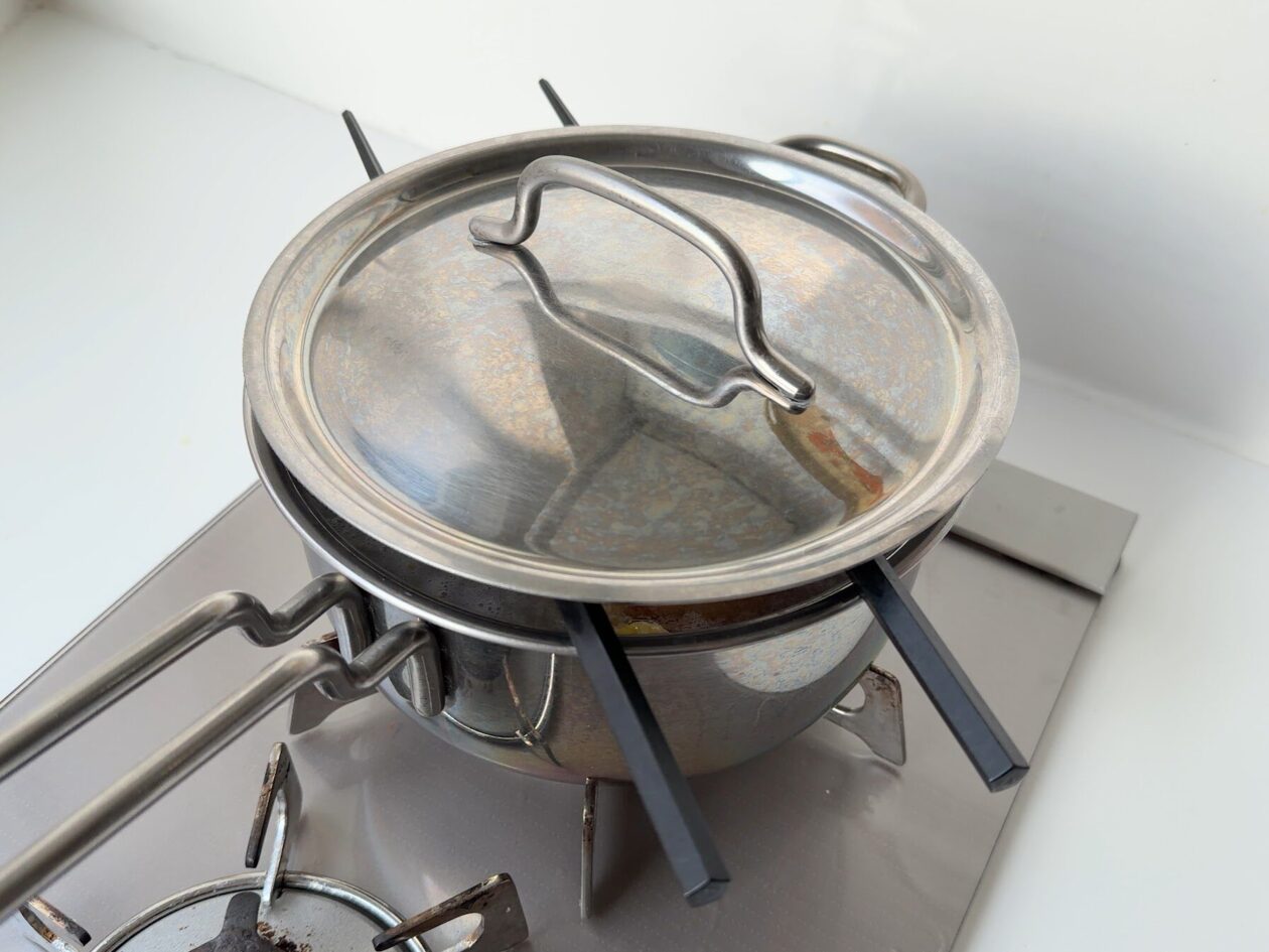 鍋の中がぽこぽこと沸いたら、鍋底から米粒をはがすようにおたまでゆっくりまぜる。鍋にお箸を渡してフタをした状態で、ふつふつと波打つ程度の弱〜中火で30分煮込む。