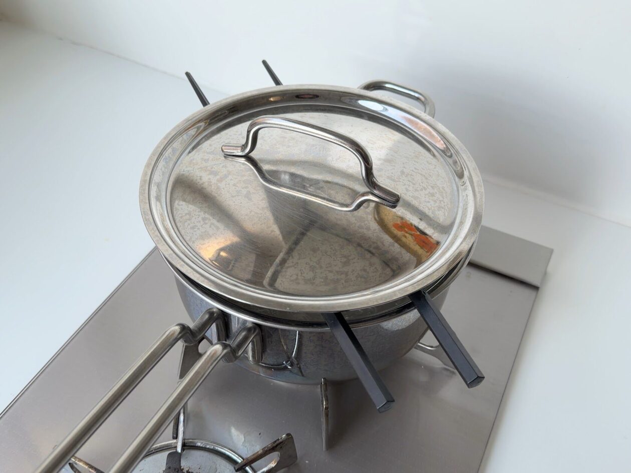鍋の中がぽこぽこと沸いたら、鍋底から米粒をはがすようにおたまでゆっくりまぜる。鍋にお箸を渡してフタをした状態で、ふつふつと波打つ程度の弱〜中火で25分煮込む。