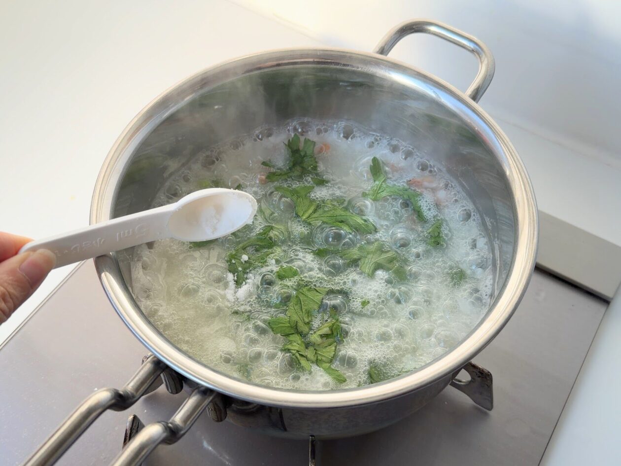 さっとアクをすくいとり、塩で味をととのえる。鍋全体をゆっくりとまぜて火を止める。フタをして5分ほど放置して蒸らす。器に盛りつけたら完成!