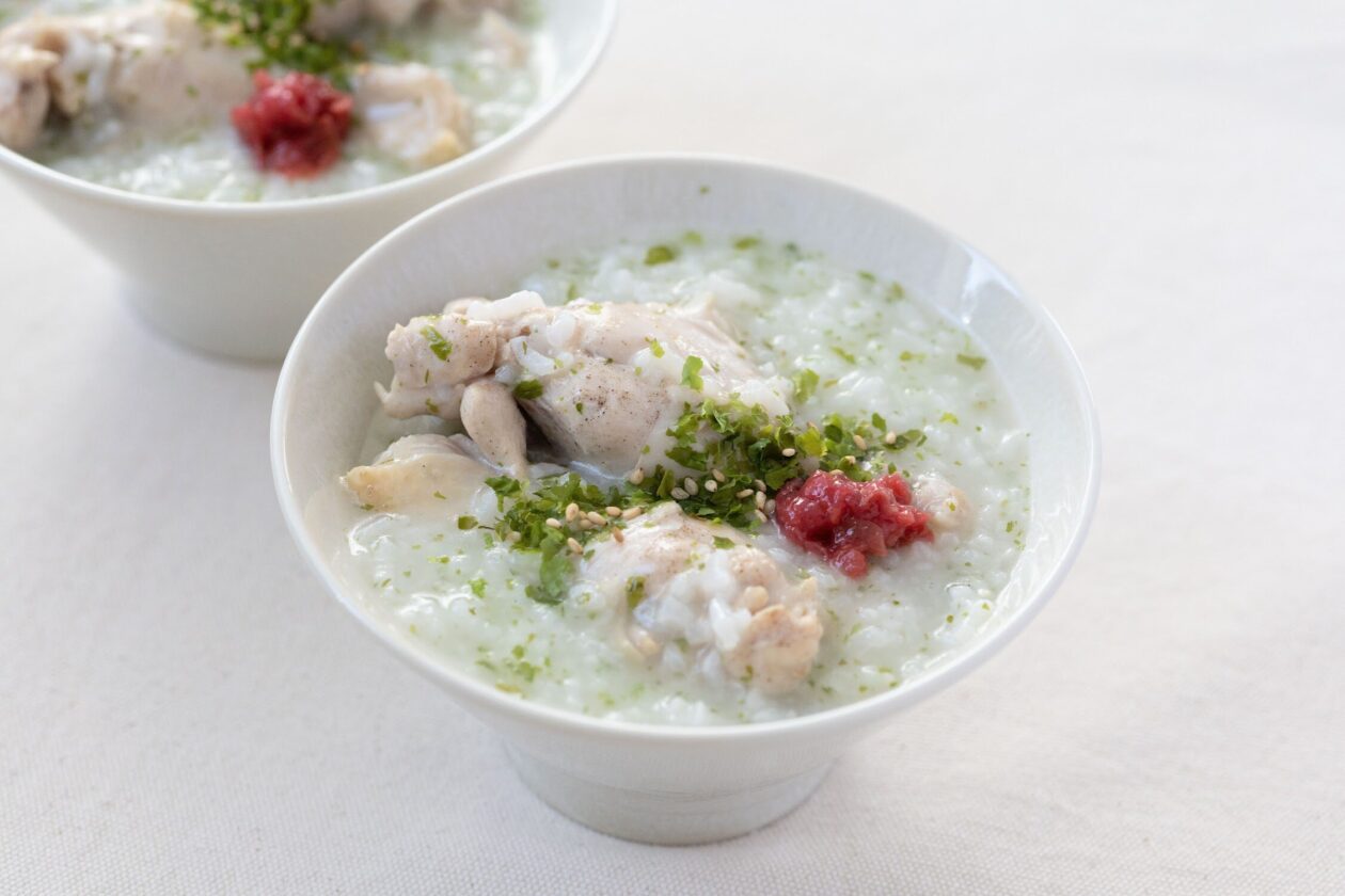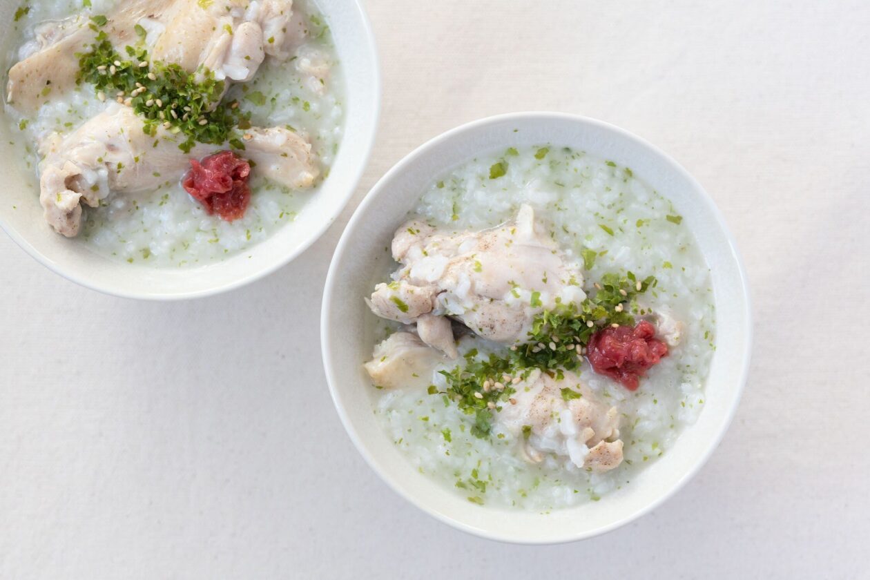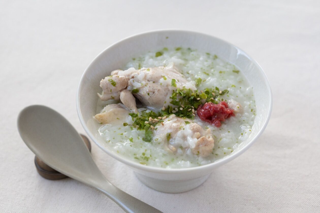 鶏のおかゆに青のりの香りを組み合わせる構成がこのおかゆのポイント。鶏肉はお好みのものでOKです!