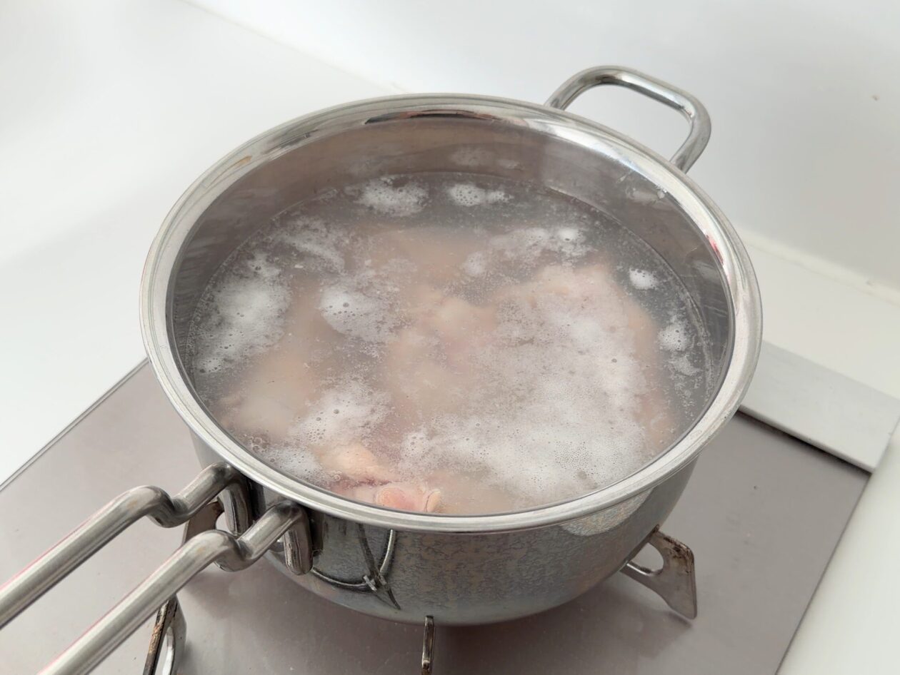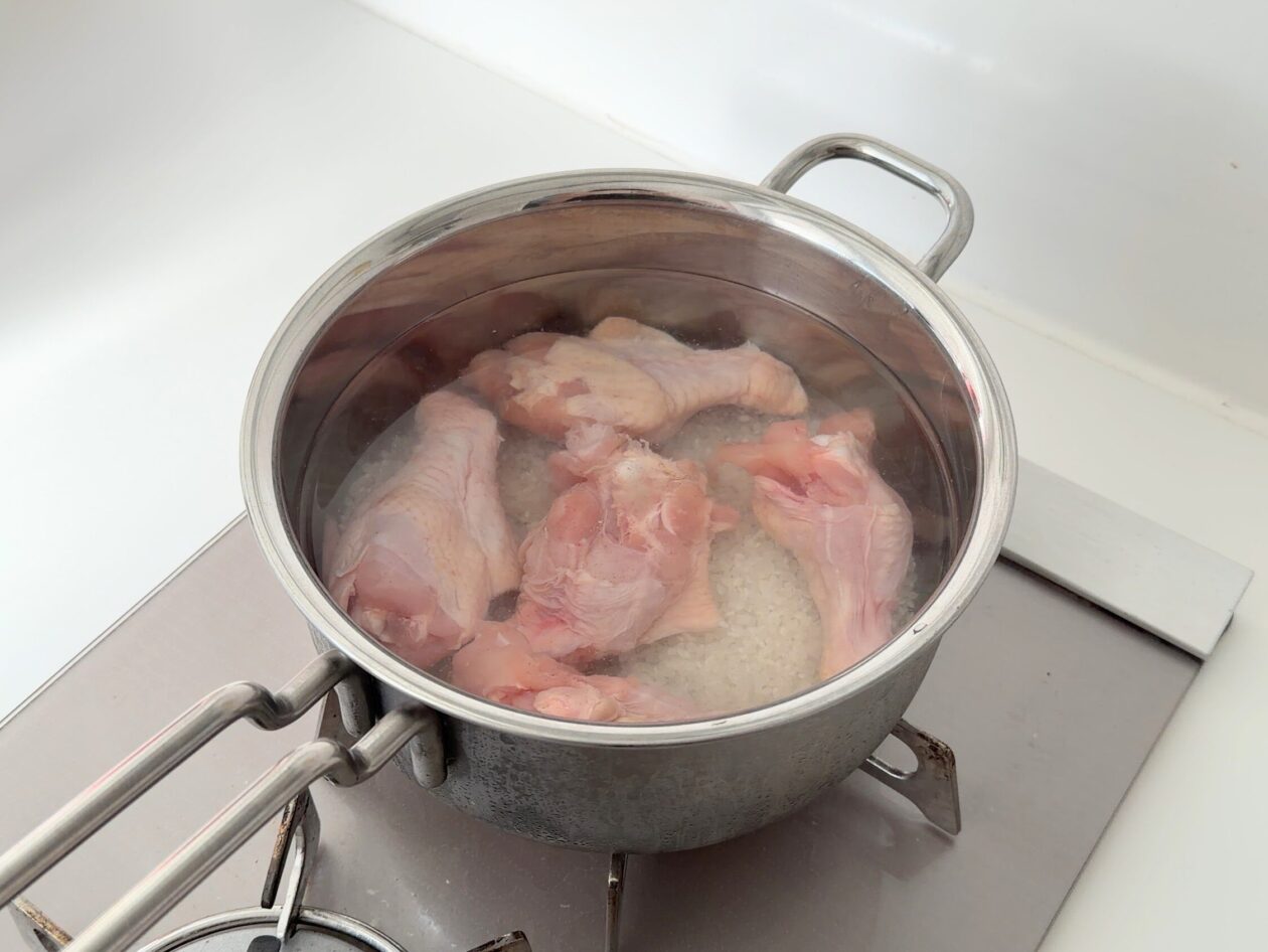 厚手の鍋に研いだ米、手羽元、水750mlを入れる。具材のかたよりがないように鍋底をならして、中〜強火にかける。