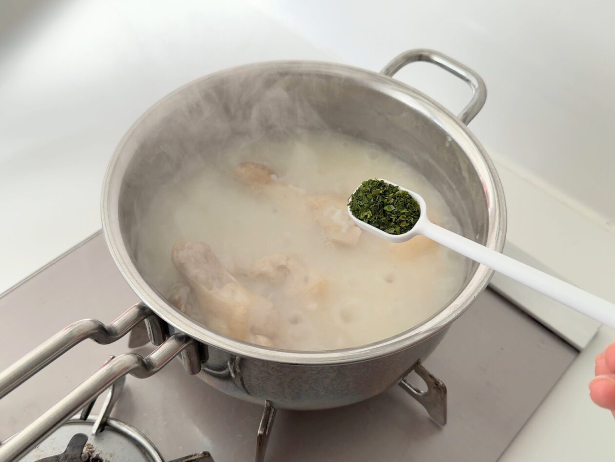 さっとアクをすくいとり、塩で味をととのえる。鍋全体をゆっくりとまぜて火を止める。青のりを混ぜ込む。