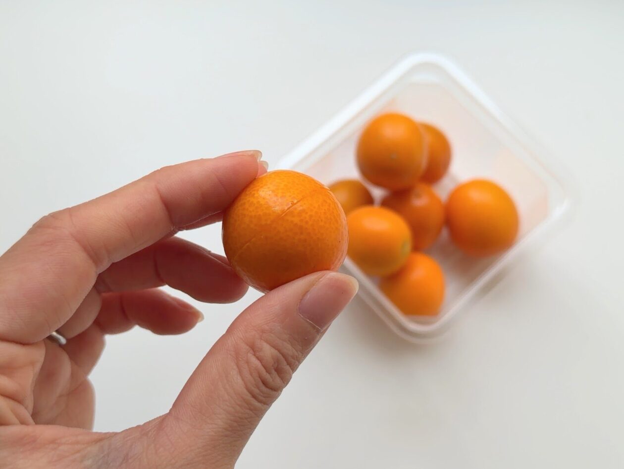 きんかんのヘタを取り、実の中心にぐるっと一周うっすら切り込みを入れる。