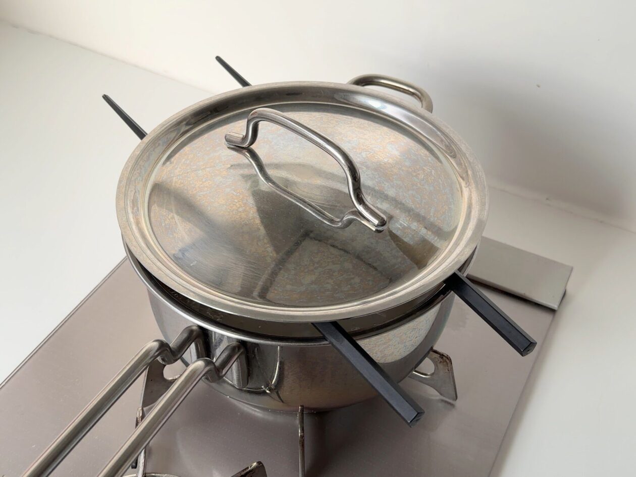 鍋の中がぽこぽこと沸いたら、鍋底から米粒をはがすようにおたまでゆっくりまぜる。鍋にお箸を渡してフタをした状態で、ふつふつと波打つ程度の弱〜中火で30分煮込む。
