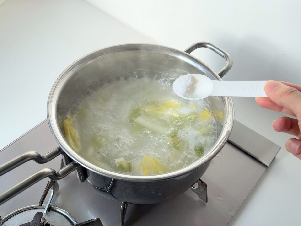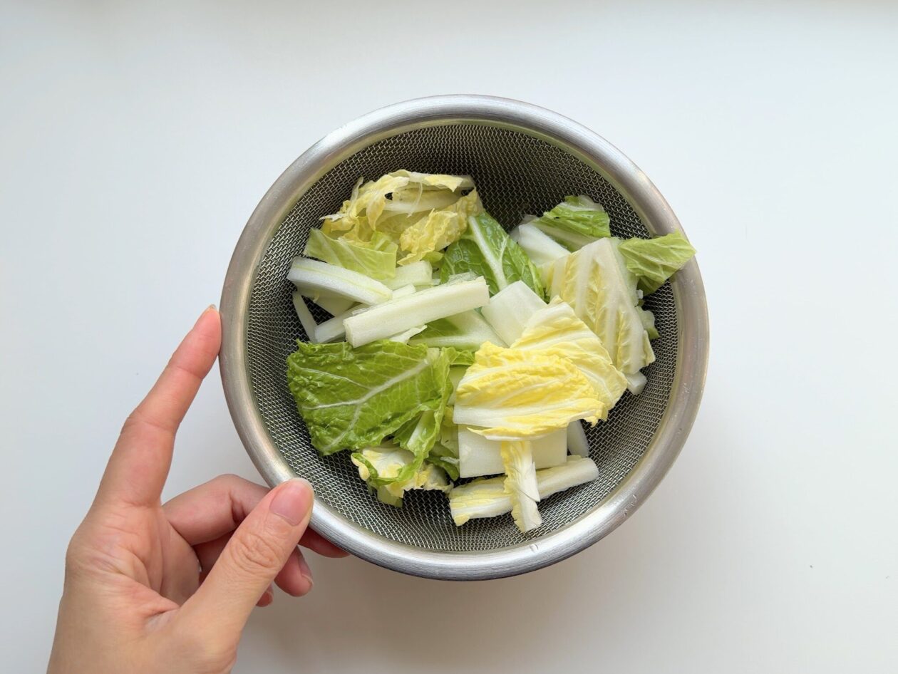 白菜を食べやすい大きさにカットする。