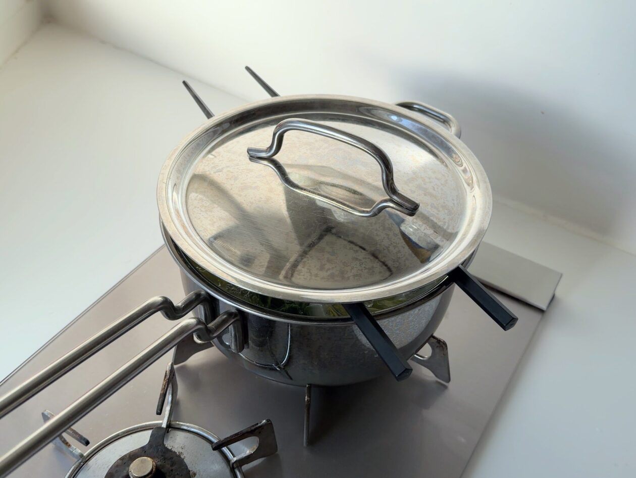 鍋の中がぽこぽこと沸いたら、鍋底から米粒をはがすようにおたまでゆっくりまぜる。鍋にお箸を渡してフタをした状態で、ふつふつと波打つ程度の弱〜中火で30分煮込む。