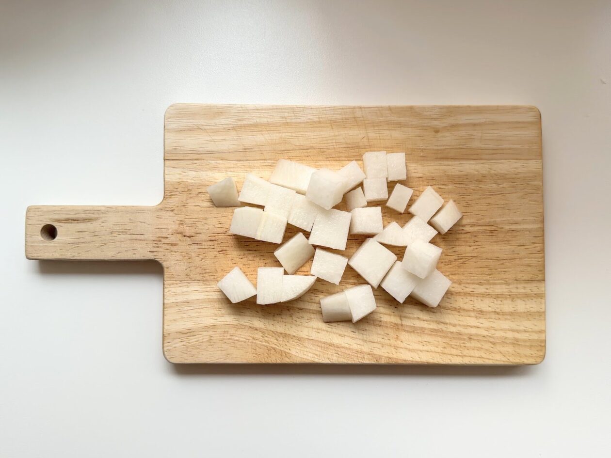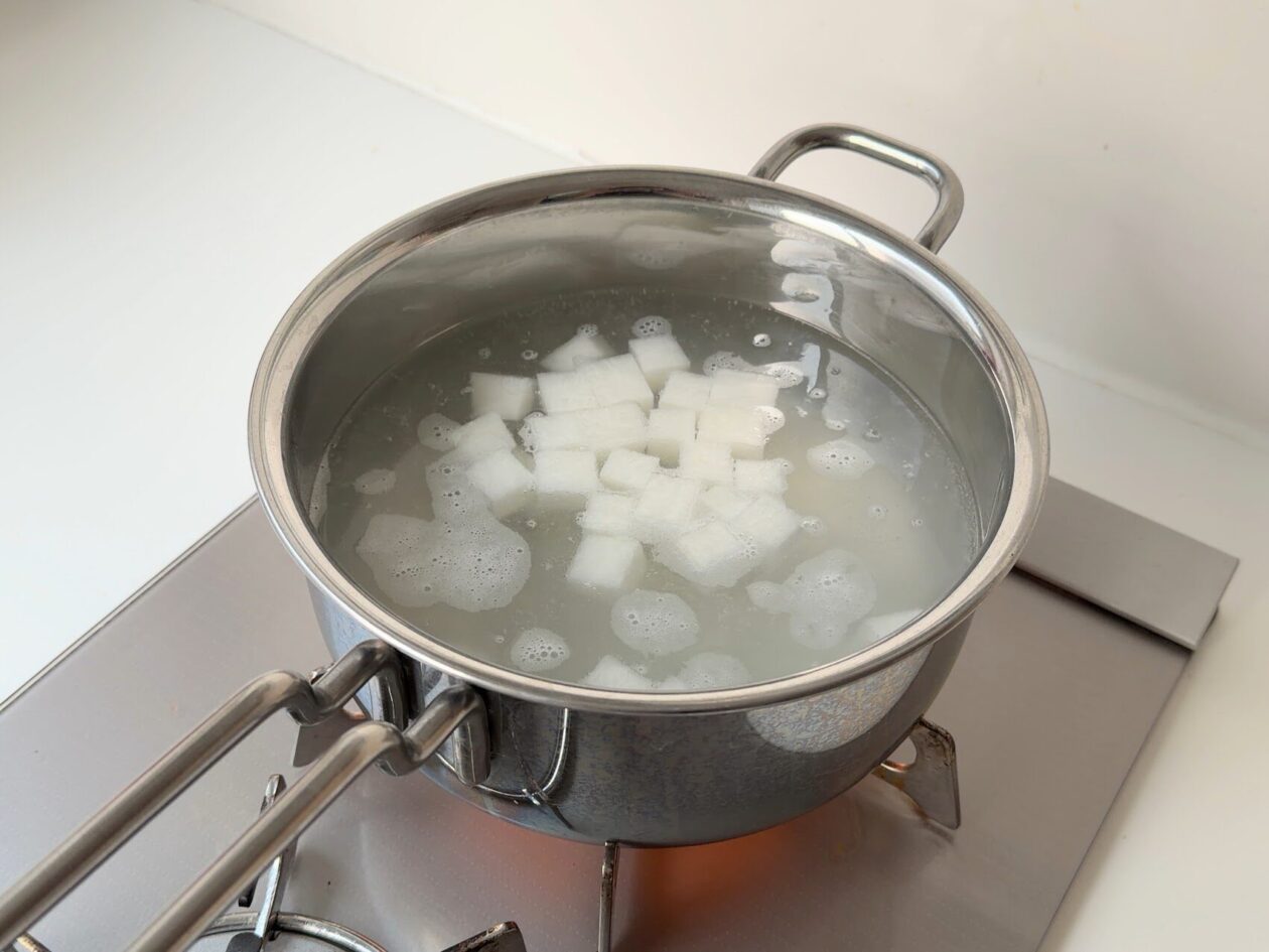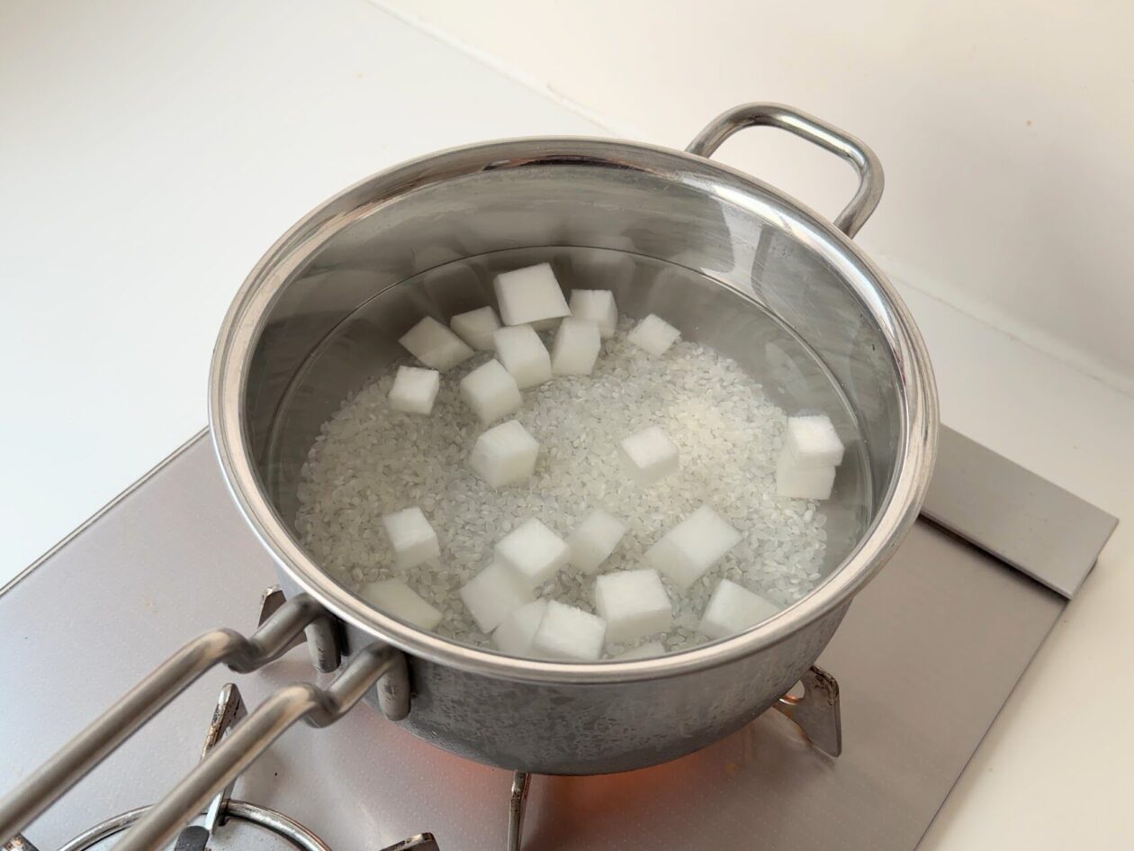 厚手の鍋に研いだ米、大根、水750mlを入れる。具材のかたよりがないように鍋底をならして、中〜強火にかける。