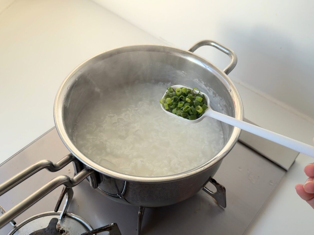 さっとアクをすくいとり、塩で味をととのえる。鍋全体をゆっくりとまぜて火を止める。小ネギを混ぜ込む。