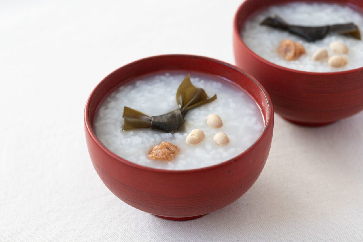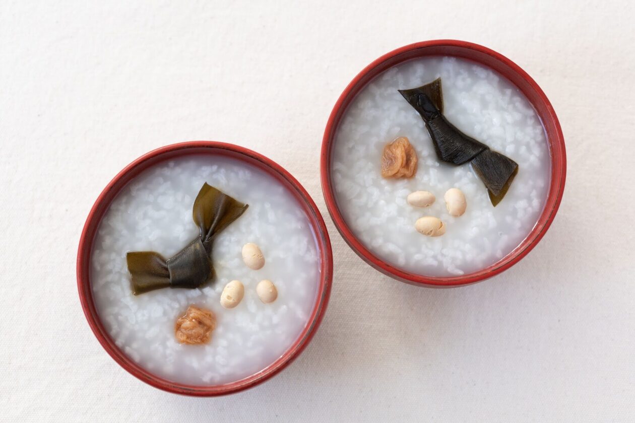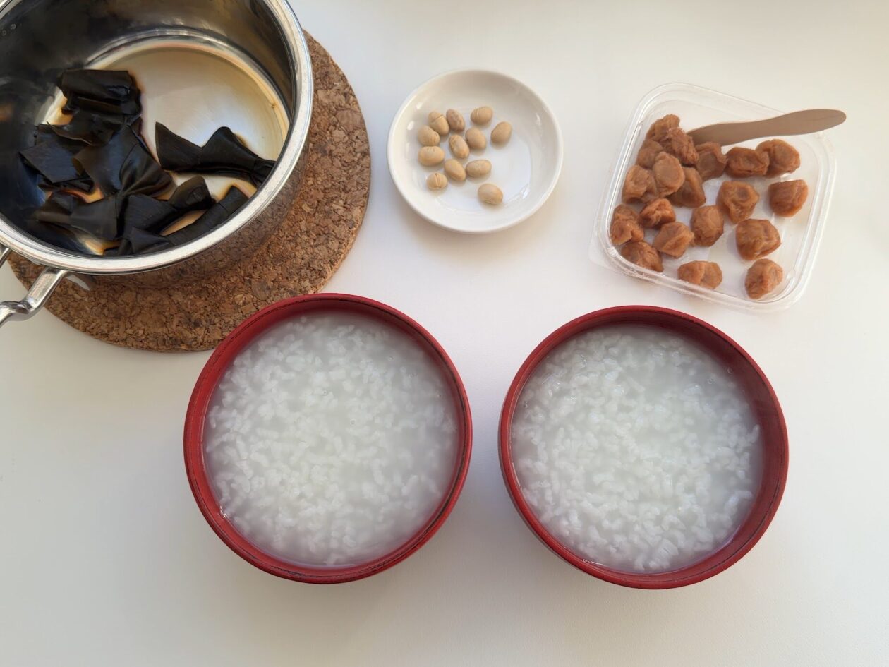おかゆを器に盛りつけ、福豆、梅干し、昆布の佃煮を乗せたら完成!