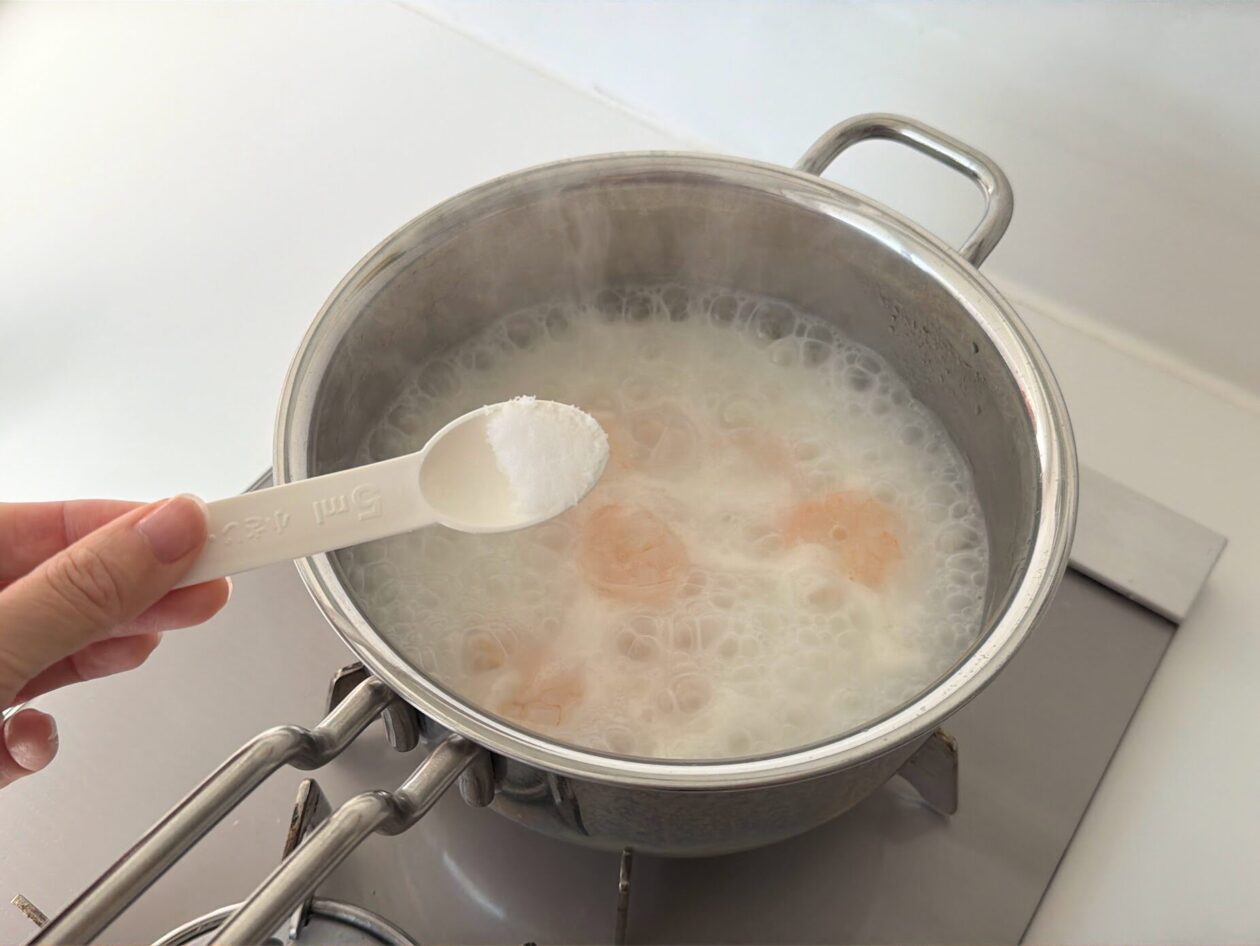 むきえびを鍋に入れる。先ほどと同様に鍋に箸をはさみ、さらに5分煮込む。