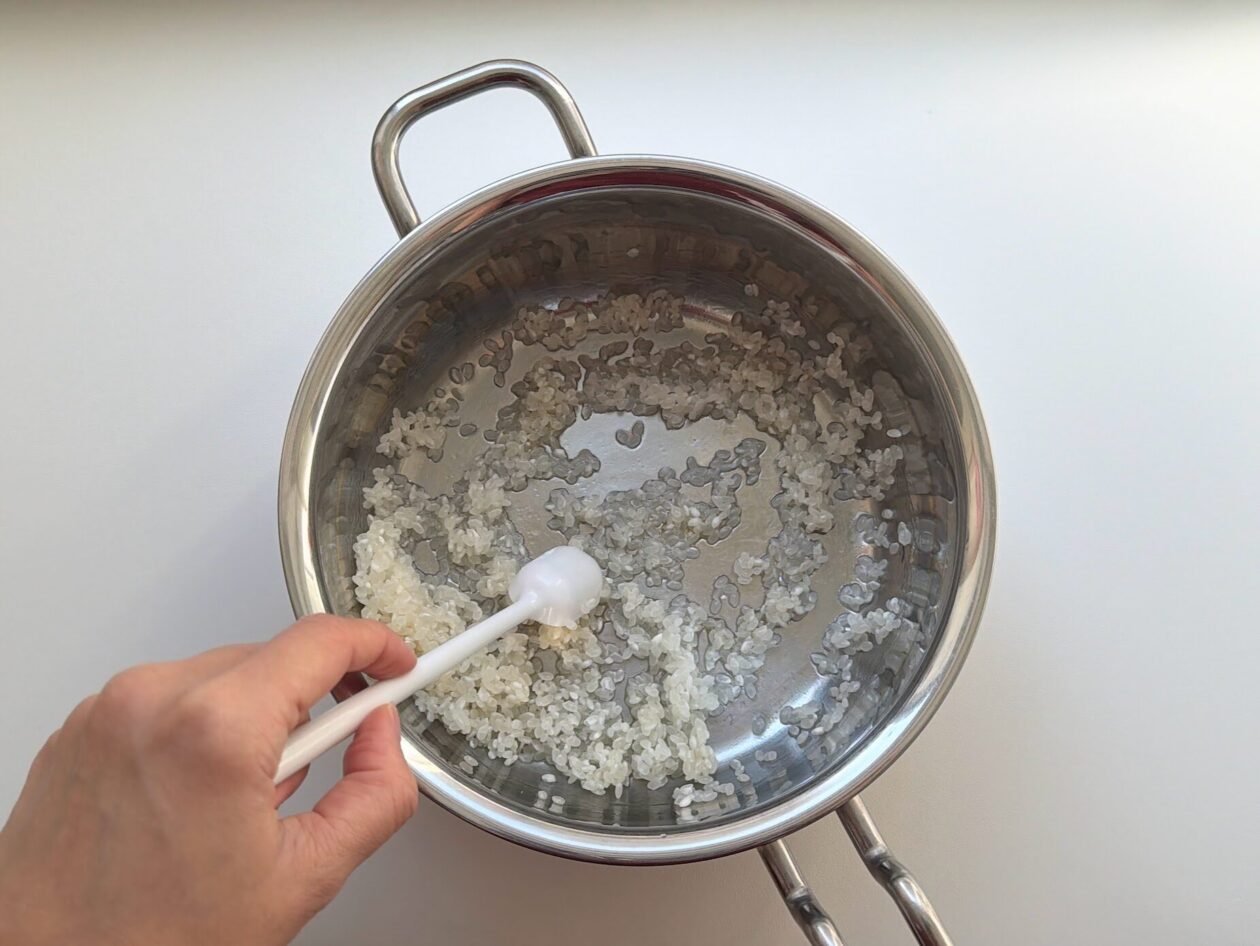 厚手の鍋に研いだ米を入れ、ごま油を絡める。