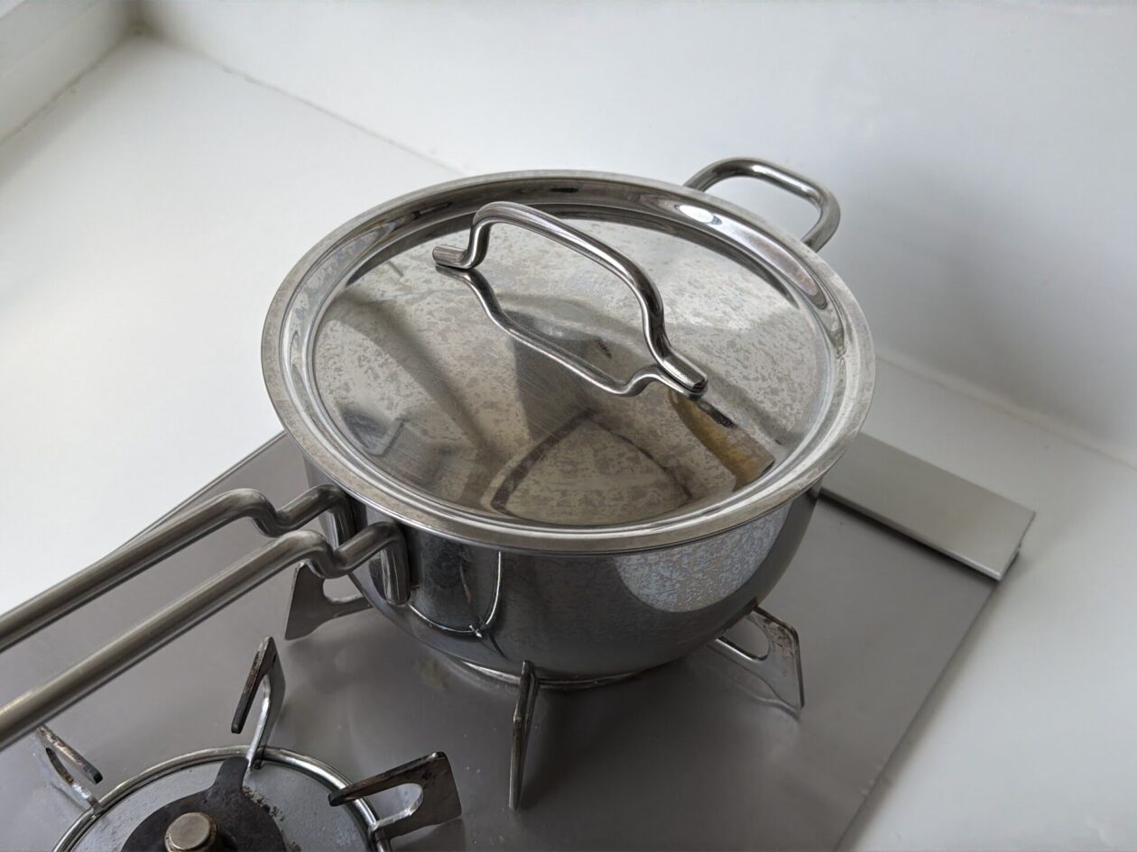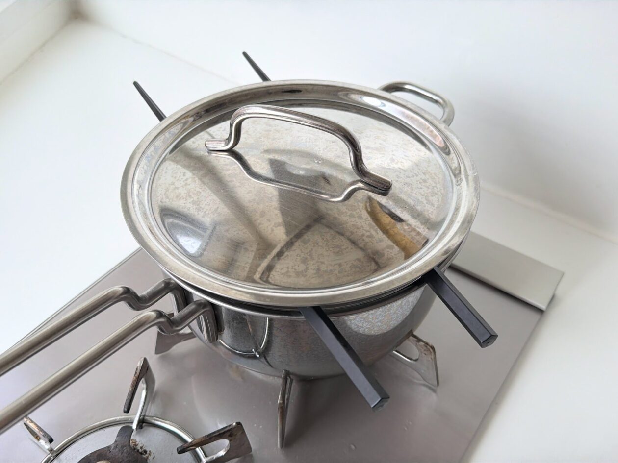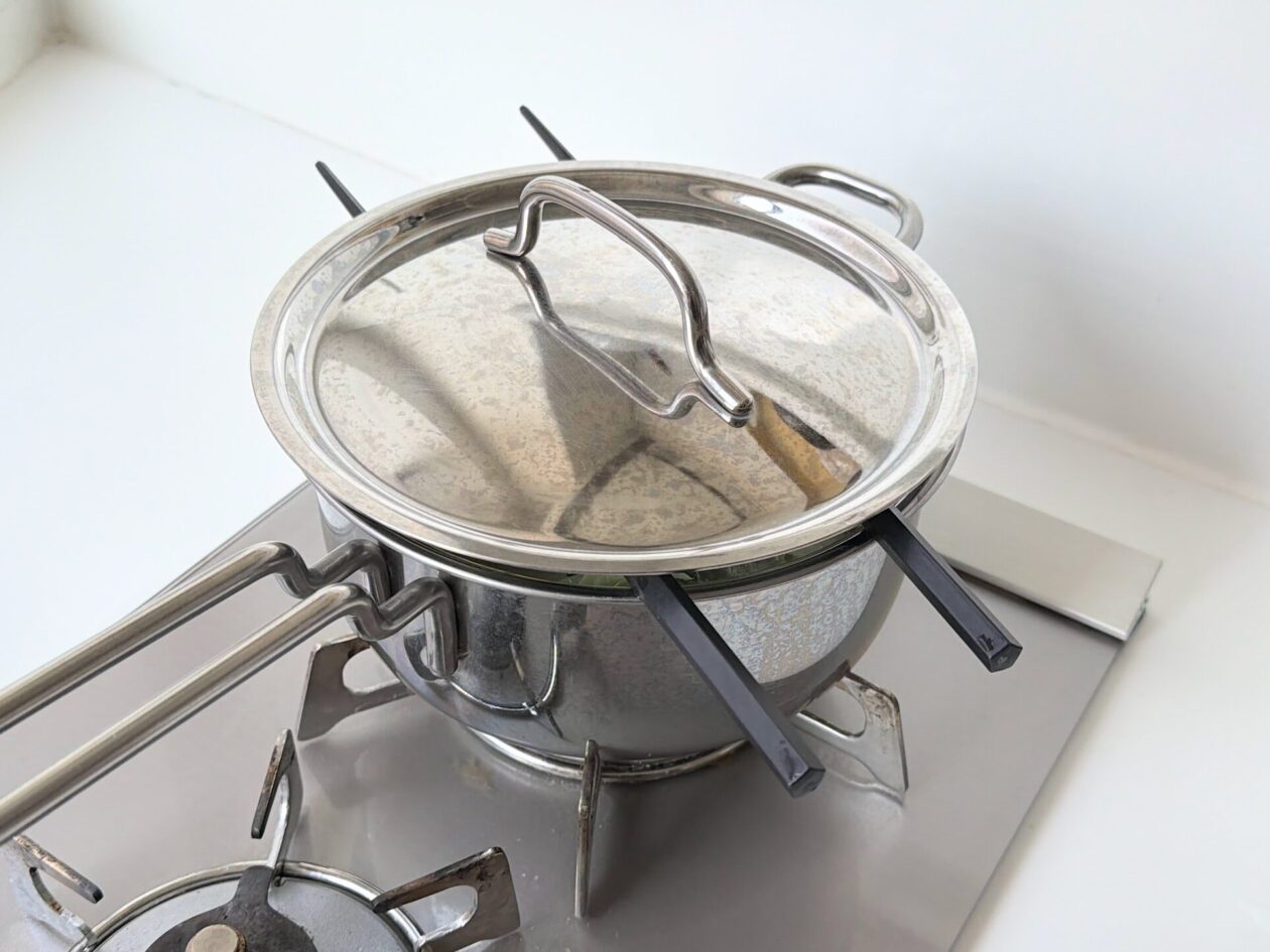 鍋の中がぽこぽこと沸いたら、鍋底から米粒をはがすようにおたまでゆっくりまぜる。鍋にお箸を渡してフタをした状態で、ふつふつと波打つ程度の弱〜中火で20分煮込む。