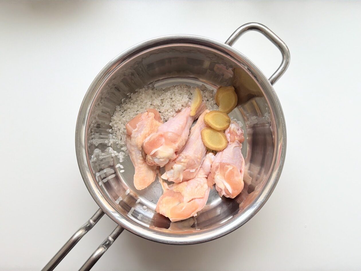 厚手の鍋に研いだ米、鶏肉、生姜、水900mlを入れる。具材のかたよりがないように鍋底をならして、中〜強火にかける。