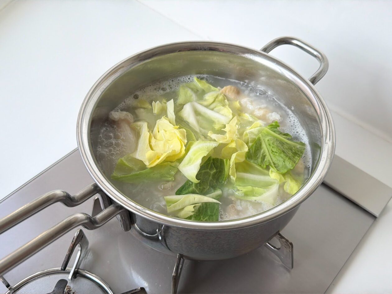 ざく切りにしたキャベツを鍋に入れる。先ほどと同様にフタをしてさらに10分煮込む。