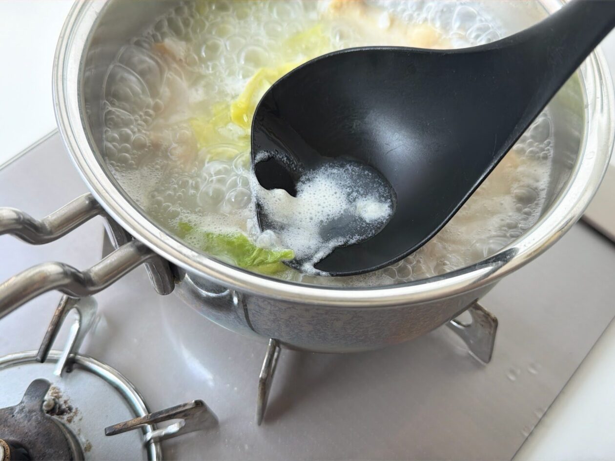 さっとアクをすくいとり、塩で味をととのえる。鍋全体をゆっくりとまぜて火を止める。フタをして5分ほど放置して蒸らす。器に盛りつけたら完成!