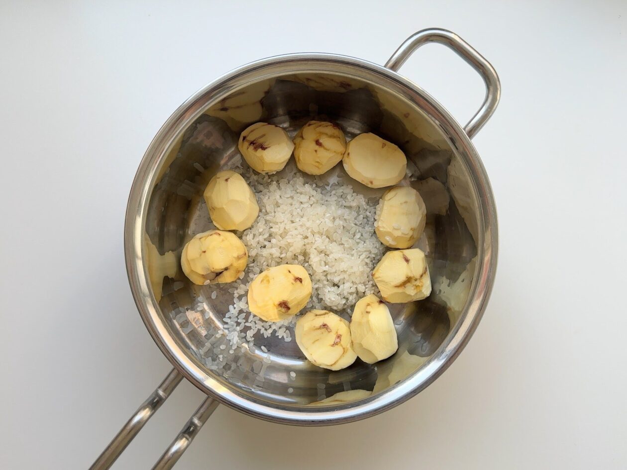 厚手の鍋に研いだ米、栗、水800mlを入れる。具材のかたよりがないように鍋底をならして、中〜強火にかける。