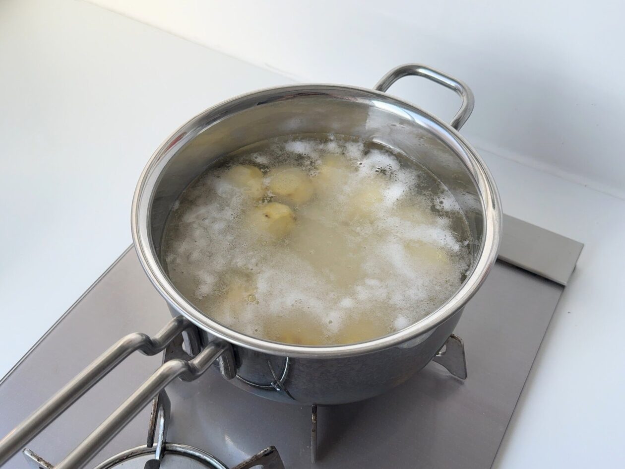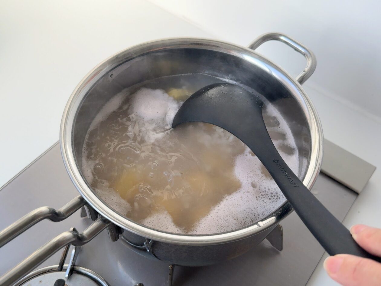 鍋全体をゆっくりとまぜて火を止めます。フタをして5分ほど放置して蒸らします。