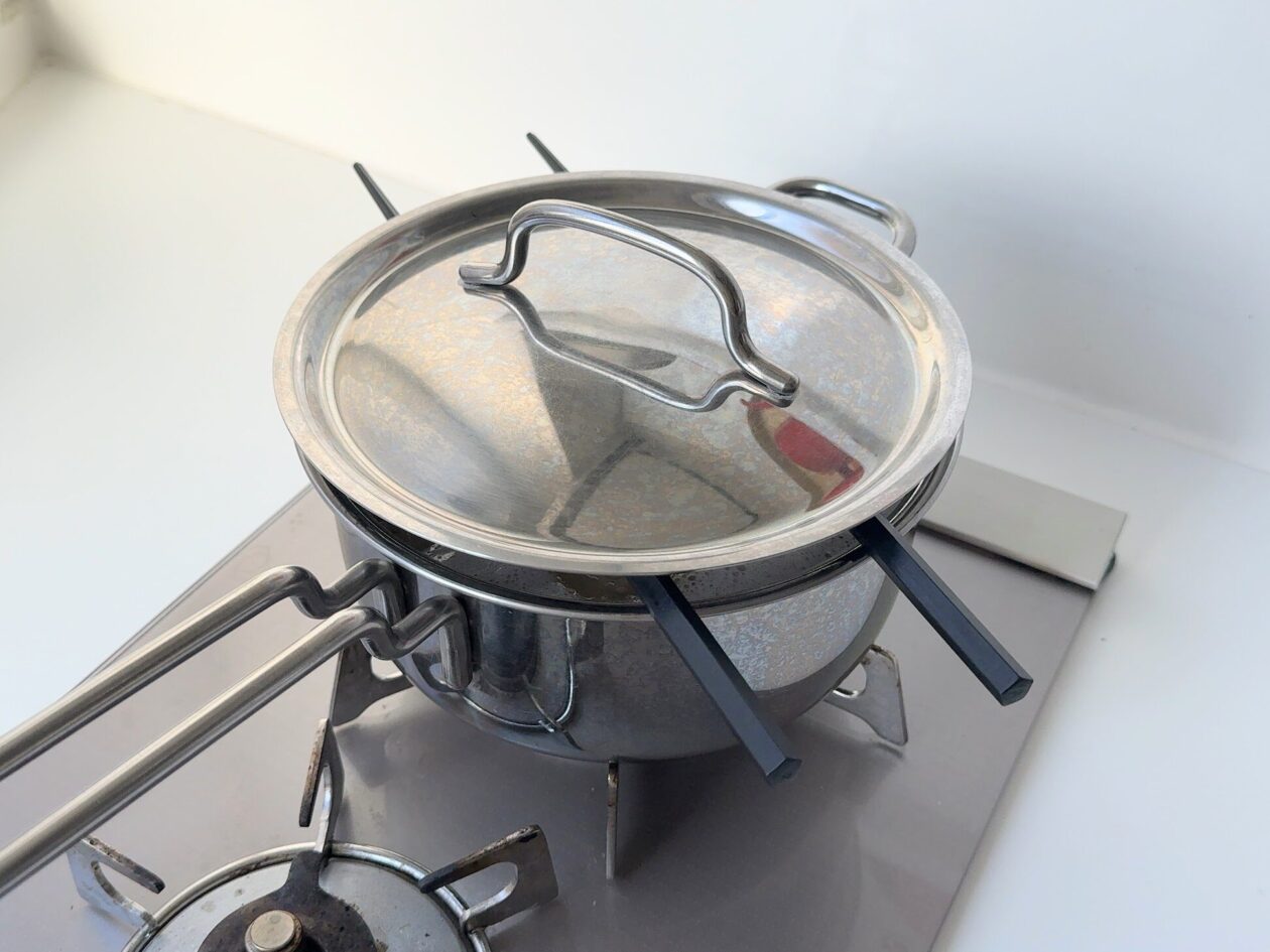 鍋の中がぽこぽこと沸いたら、鍋底から米粒をはがすようにおたまでゆっくりまぜる。鍋にお箸を渡してフタをした状態で、ふつふつと波打つ程度の弱〜中火で30分煮込む。