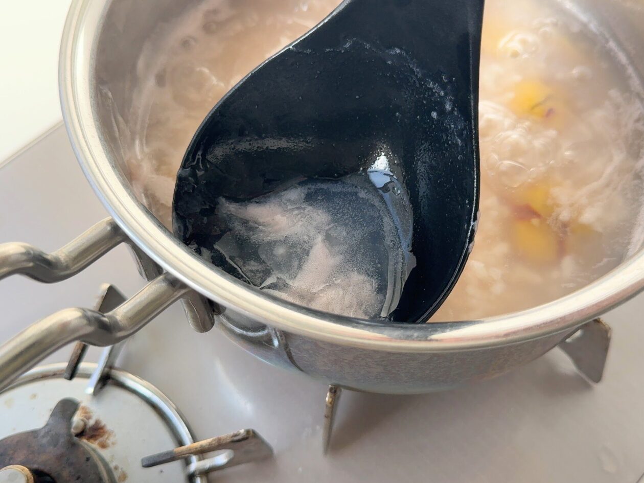 栗は重みがあるため、鍋底にこびりつきやすく、もっちり狙いの少なめ水分量のときは崩れてしまうことも多々。水分多めのとろとろ仕立てにすることで、栗のゴロッと食感をたのしむことができるうえ、栗の甘みをふわりと広げることができるのです。