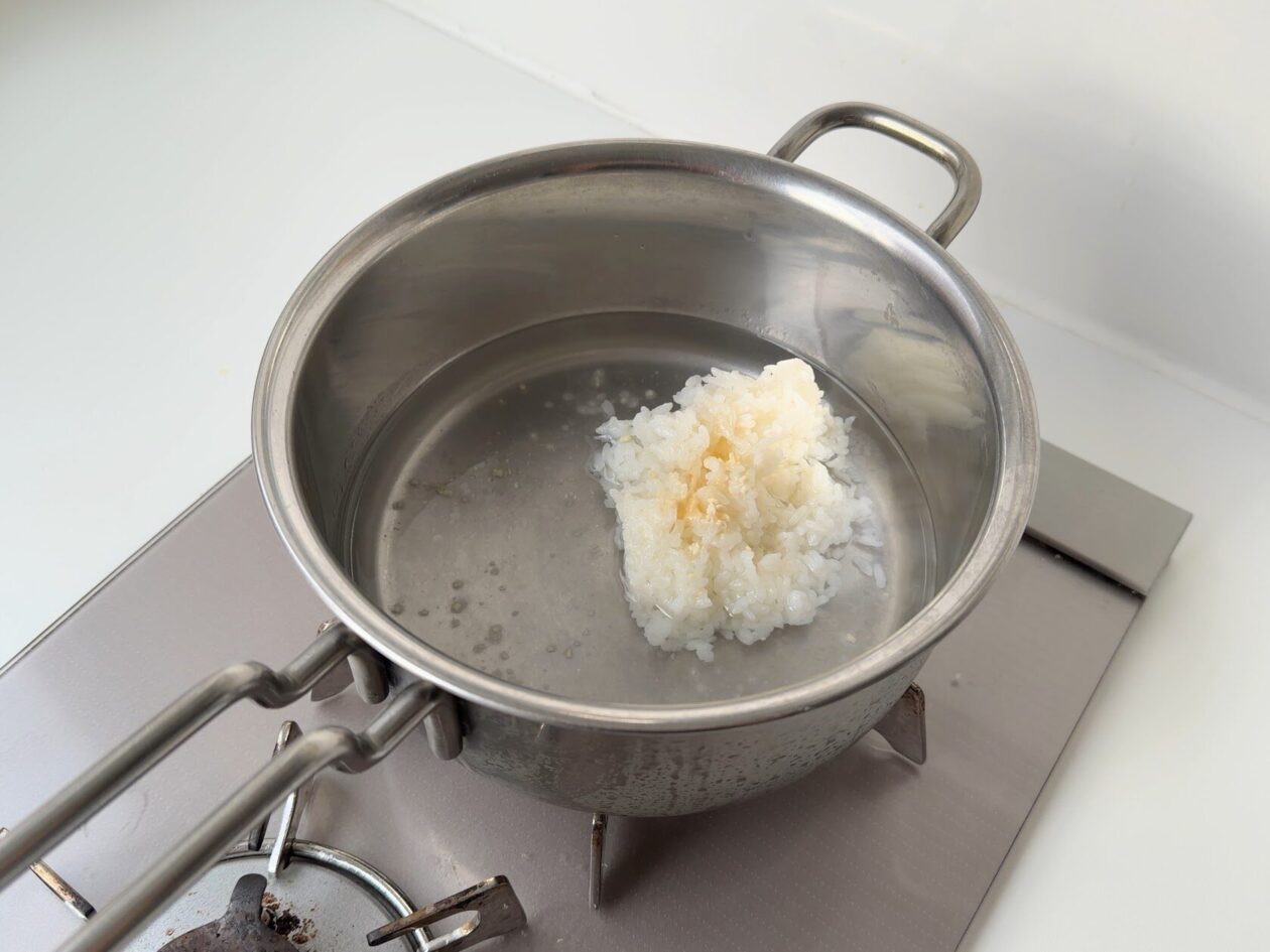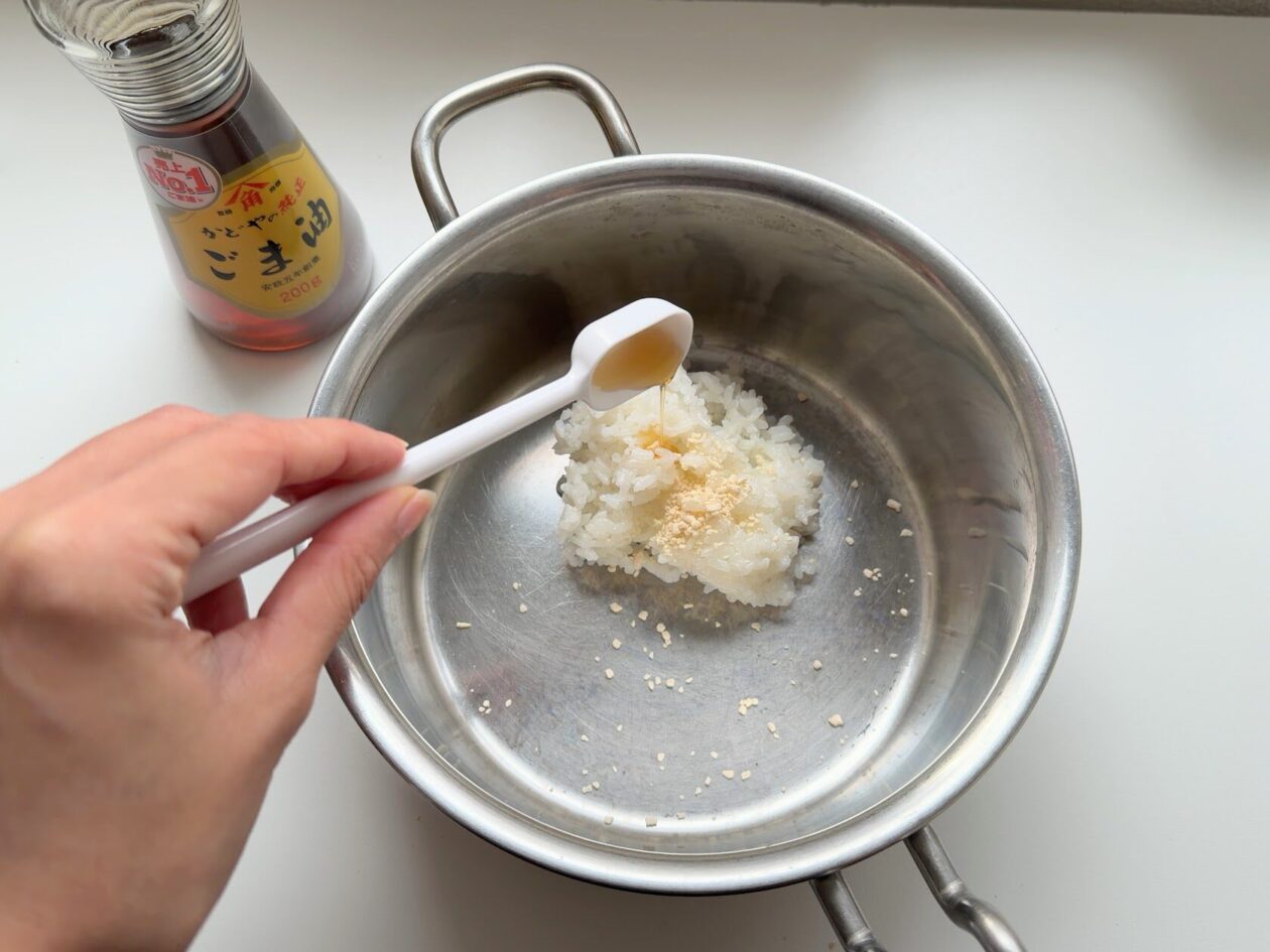 鍋にごはん、ごま油、水300mlを入れ、中火にかける。