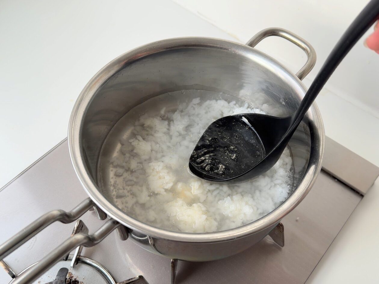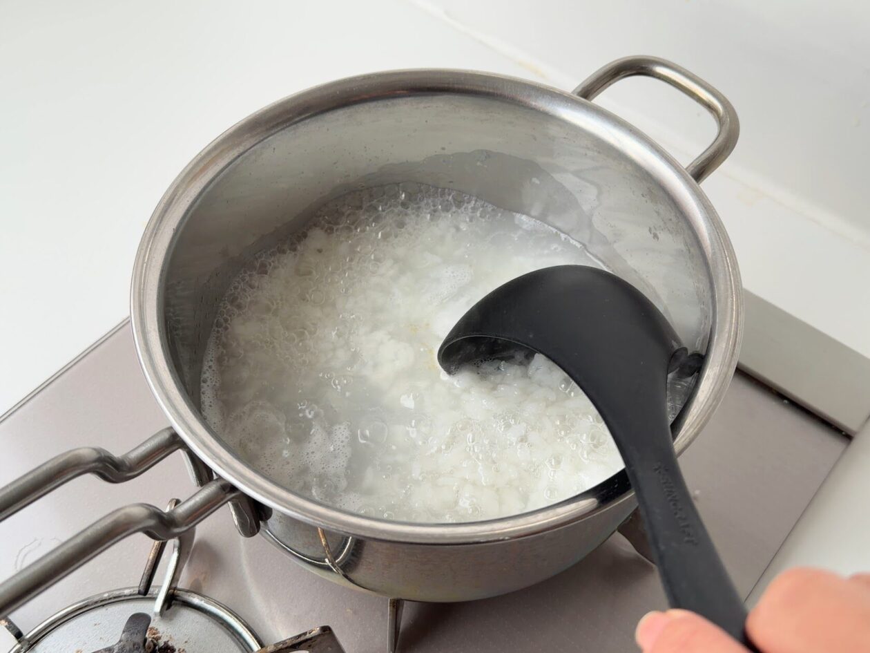 鍋の中がふつふつと湧いたら、おたまの背でやさしくごはんをほぐす。ときどき混ぜながら5〜10分ほど、弱火で煮込む。