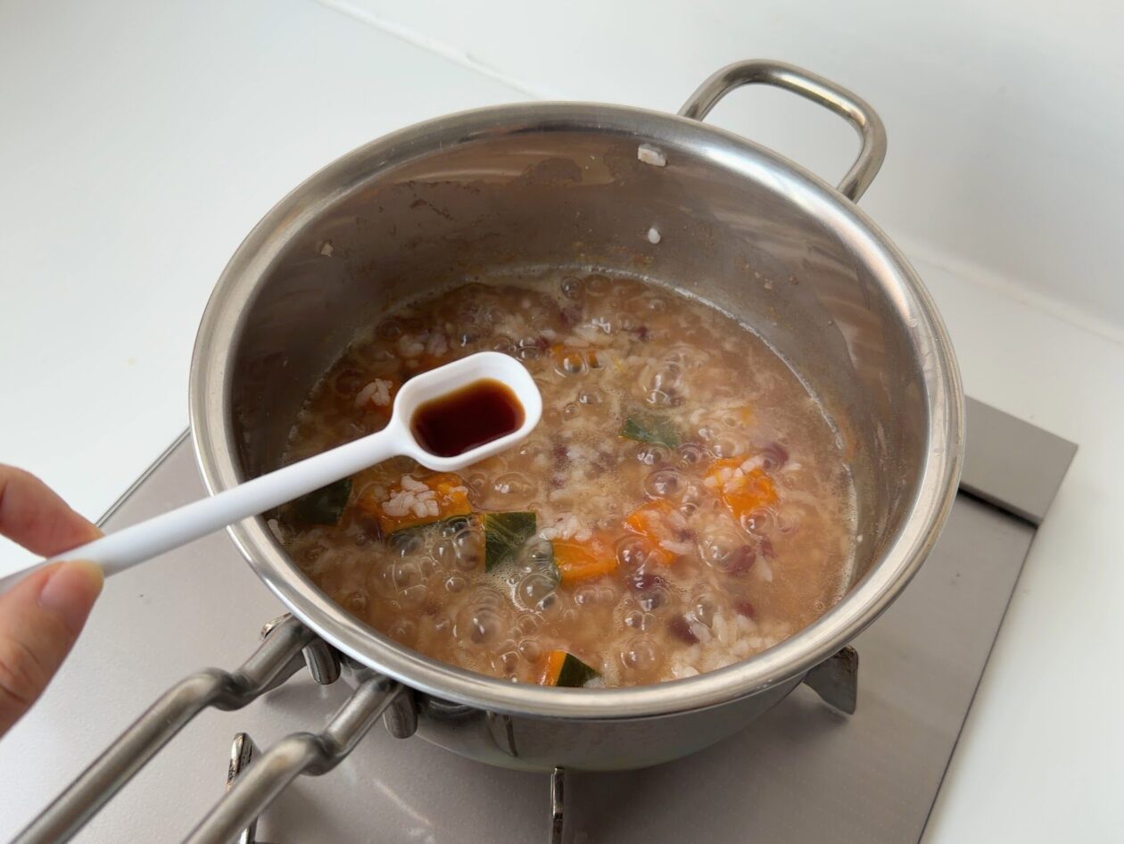 全体としてはかなり「甘いおかゆ」なのですが、お醤油を入れることでより親しみやすい味わいに。かぼちゃの煮物や、お団子のみたらしあんもそうですが、甘味と醤油の組み合わせは、はじめてなのに懐かしい、ほっとするおいしさがありますよね。