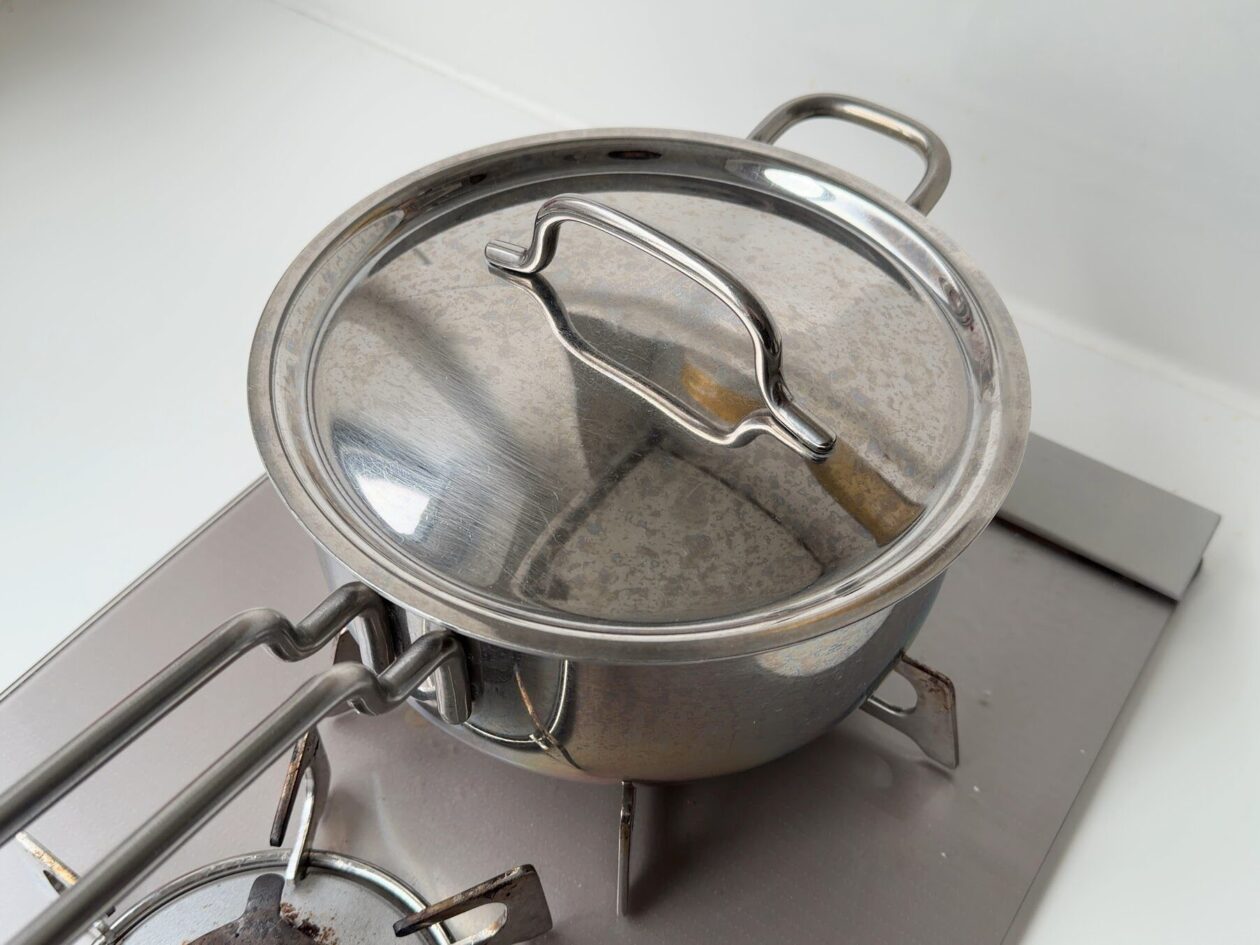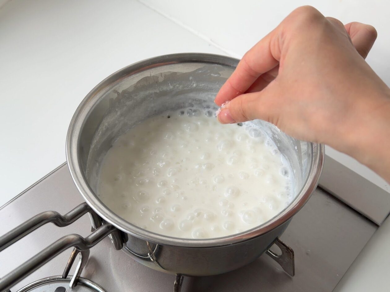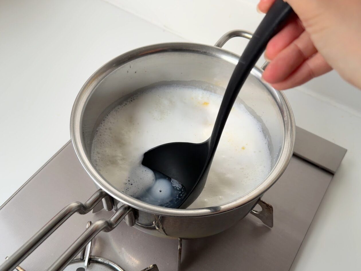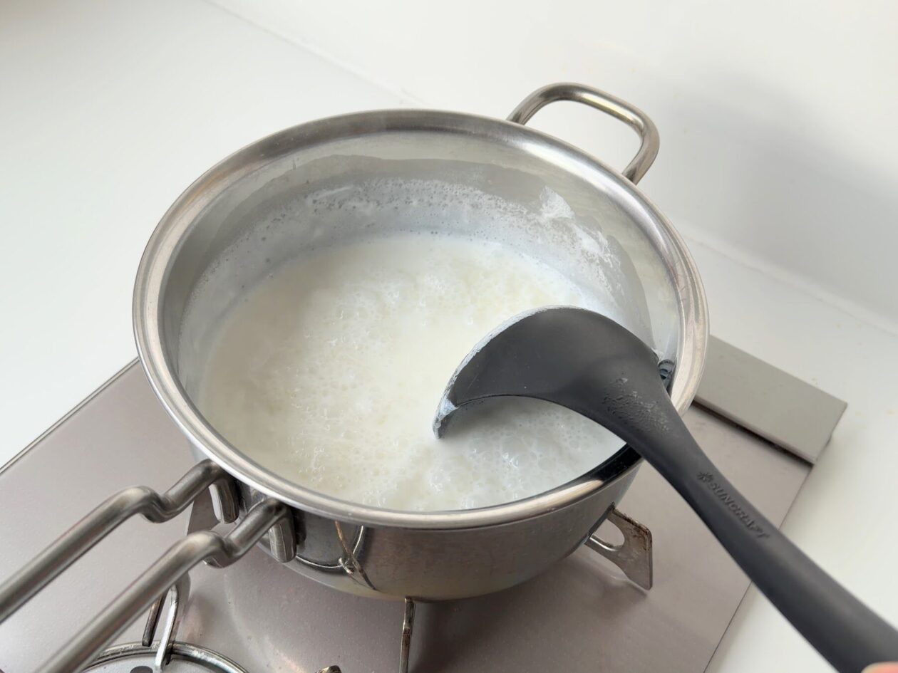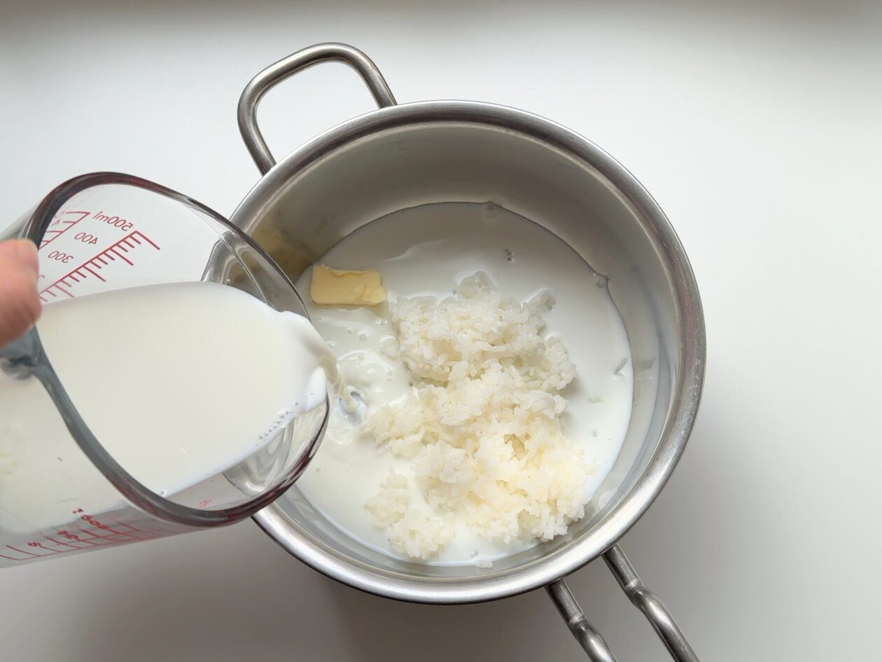 100%ミルクで煮込んでしまうと、コッテコテのギットギトの吹きこぼれ祭りになってしまうので、水で割って調理するのがポイントです。水:ミルク=1:1か、2:1くらいの比率がおすすめです。