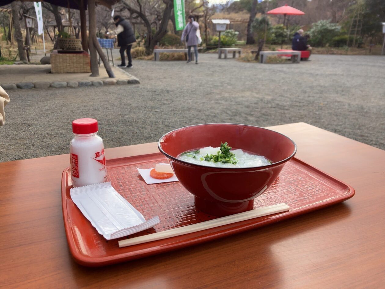 園内のお茶処「茶亭さはら」さんでいただけるのは王道シンプルな七草粥。お餅が入っていて、ボリューム感◎