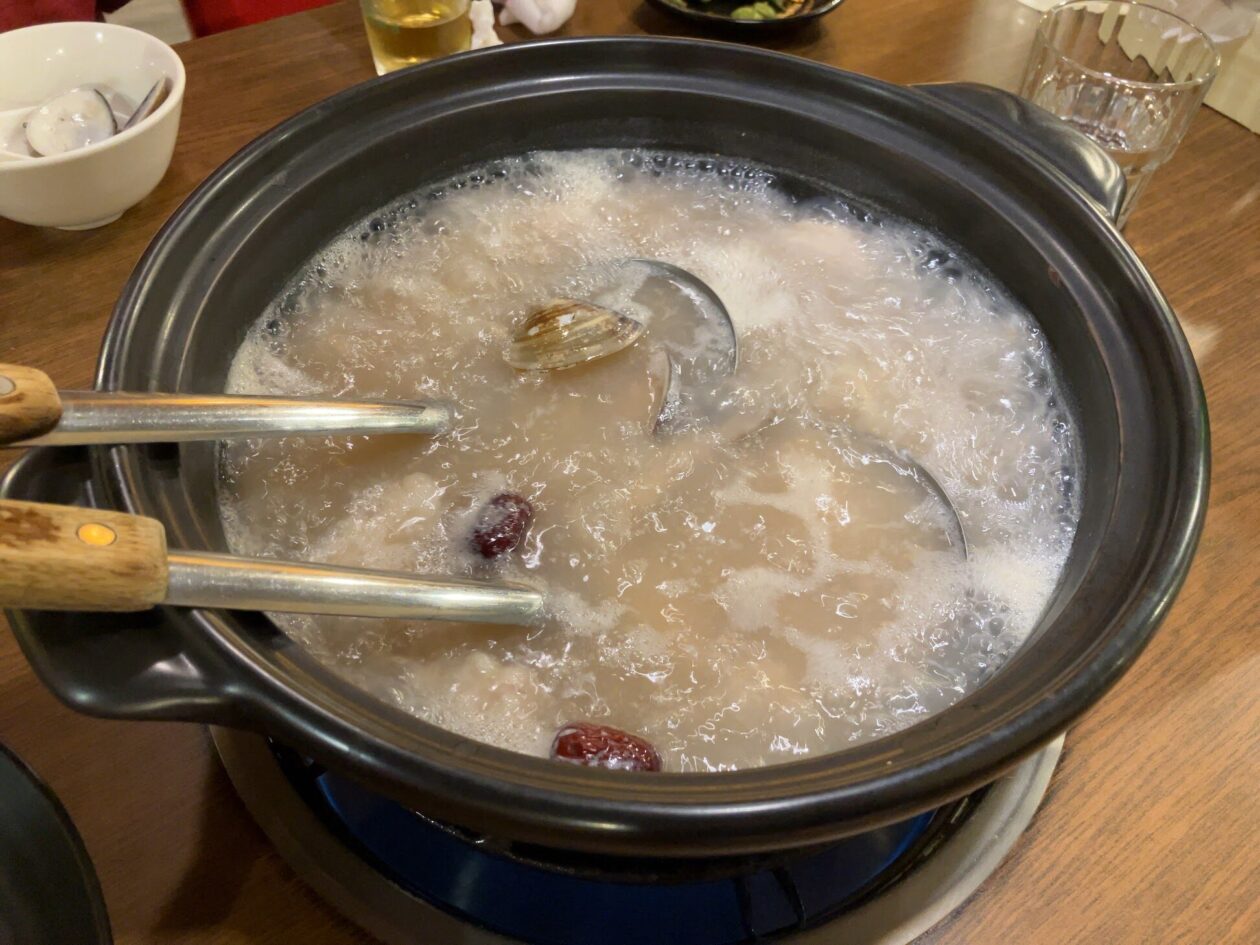 海鮮は海鮮だけ、きのこはきのこだけ、肉は肉だけ、それぞれを順番にいただくことで、お鍋のスープを徐々に「育てていく」感じ。乳白色だったお鍋は最後は濃い色に。